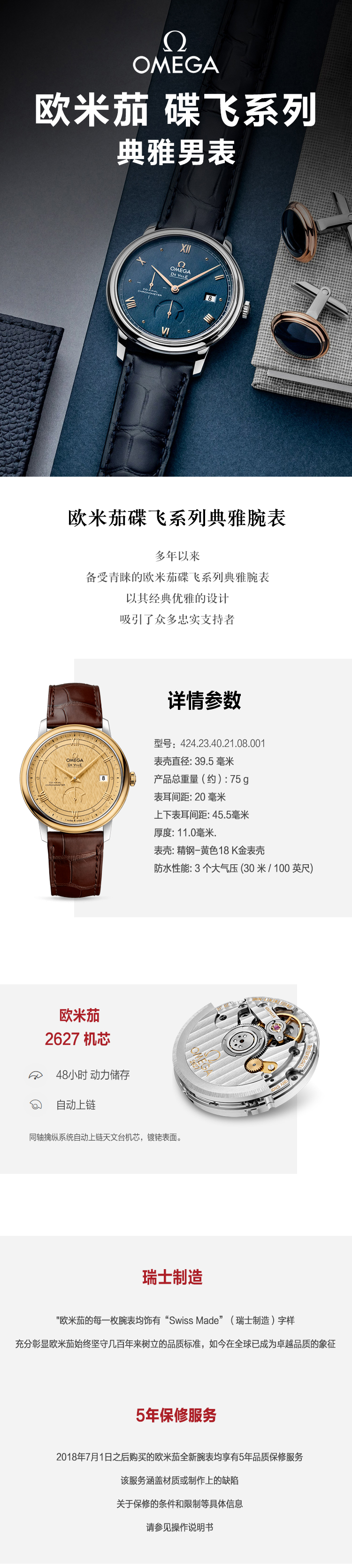 OMEGA欧米茄 碟飞典雅系列同轴动力储存显示机械男表424.23.40.21.08.001 金色