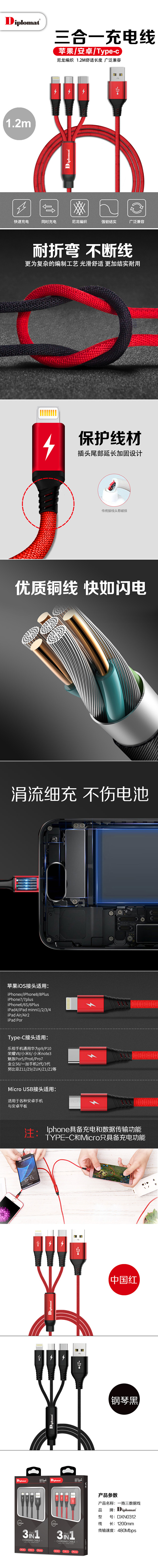 Diplomat 三合一编织数据线 DXN0312(单位:个) 黑色