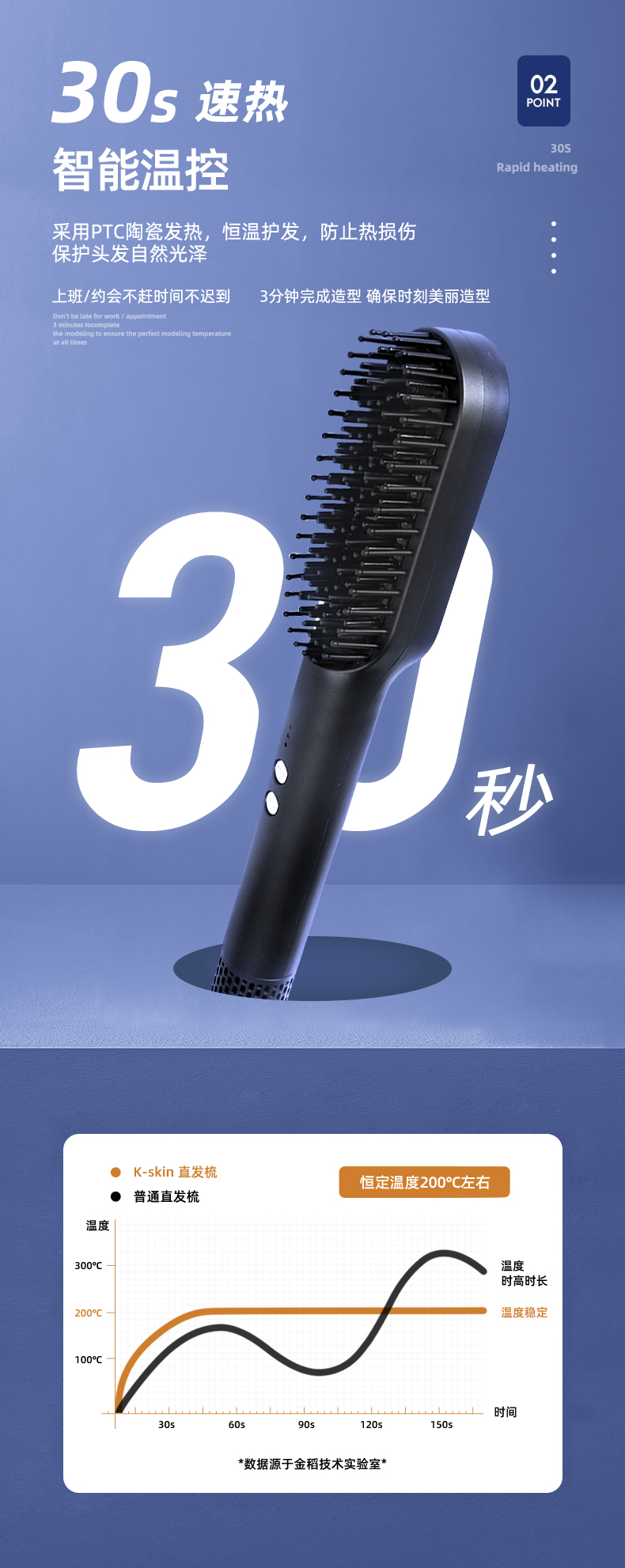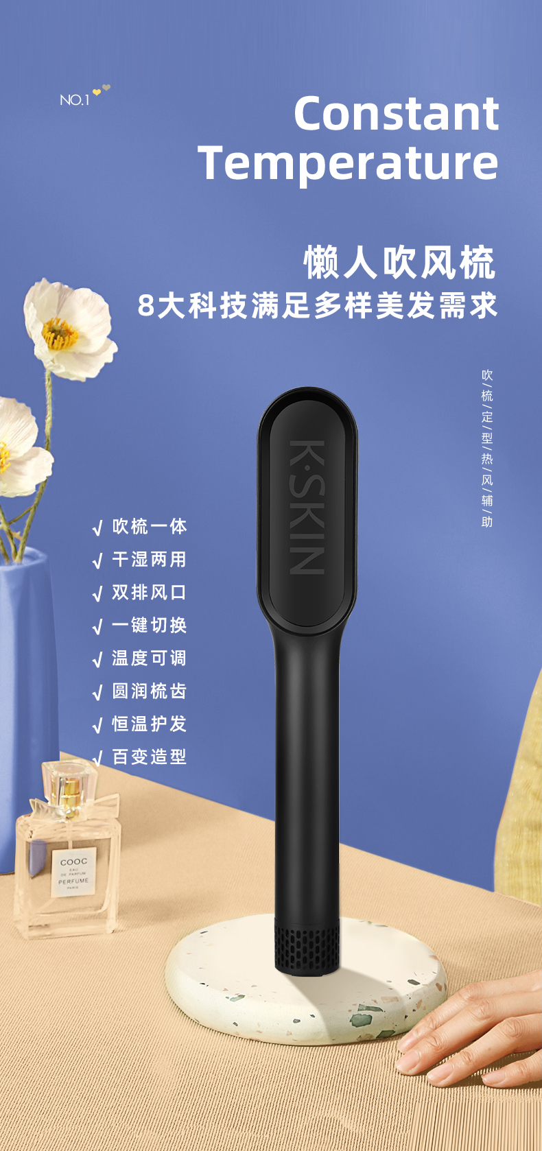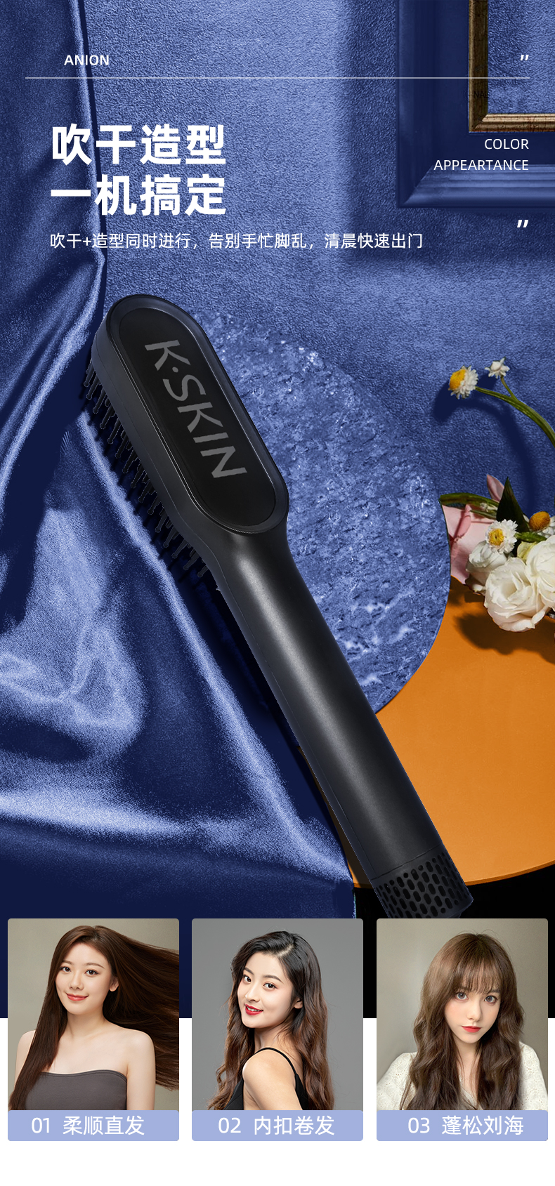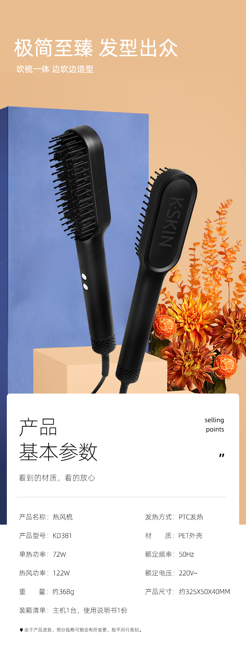 金稻 吹风梳冷热风梳干湿两用造型梳一梳直电动直发梳不伤发电梳子KD381(单位:台) 曜石黑