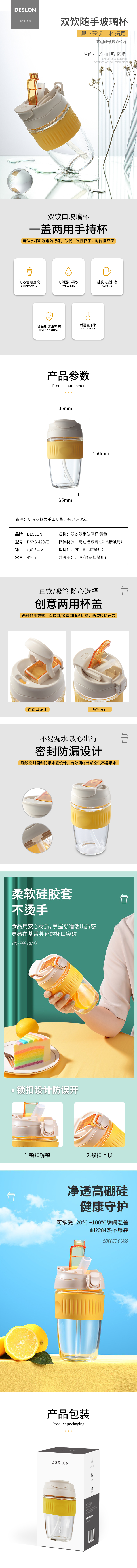 德世朗(DESLON)双饮随手玻璃杯 DSYB-420YE(单位:套) 黄色