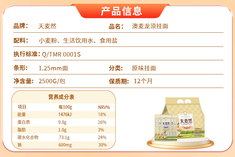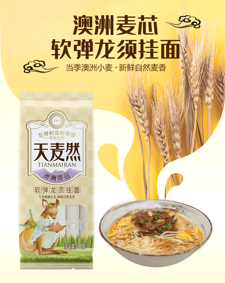 五得利(WUDELI) 天麦然 澳洲麦芯软弹龙须挂面500g*5(单位:袋) 黄色