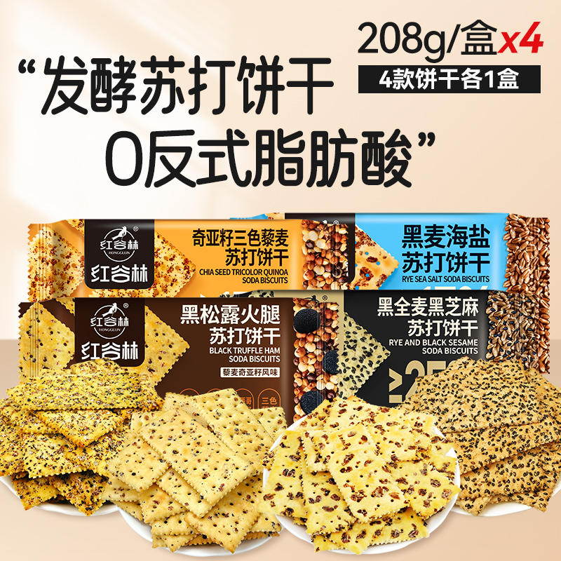 红谷林苏打组合黑松露+黑芝麻+奇亚籽藜麦+黑麦海盐208克*4袋(单位:袋) 混色