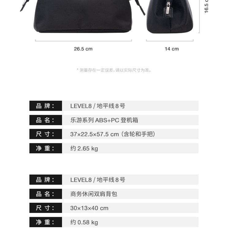 地平线8号(LEVEL8)商务套装B(双肩包+收纳袋+拉杆箱)1736/1775/1616 单位:套 曜石黑