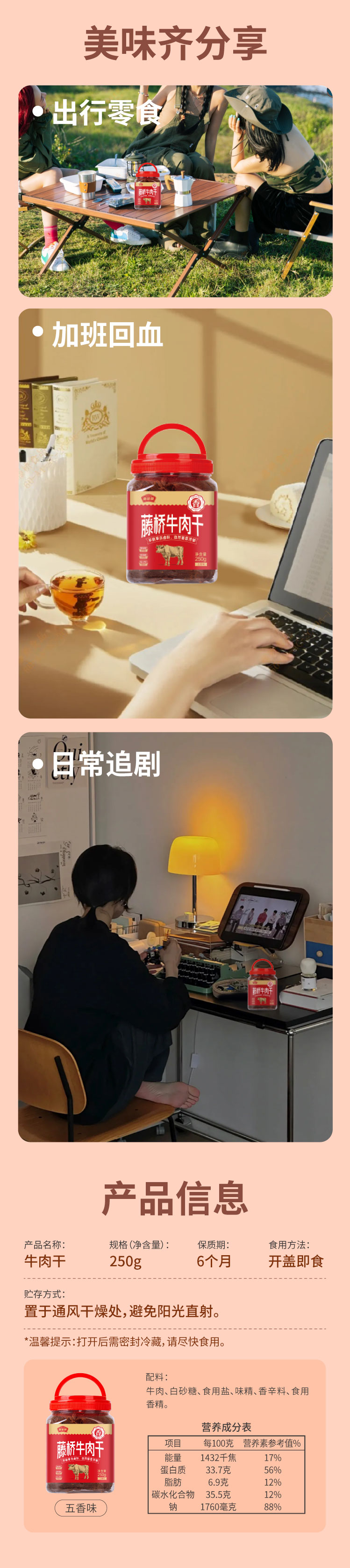 藤桥牌 藤桥牛肉干 250g 五香味牛肉干 红色(单位:罐)