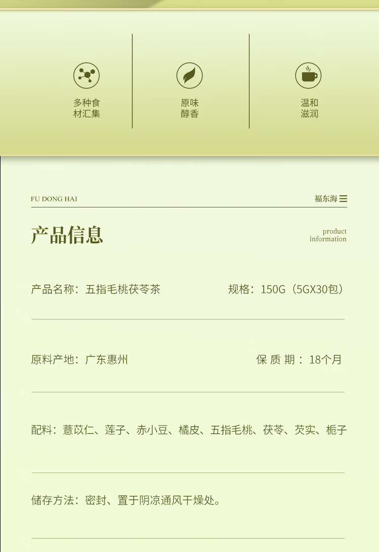 福东海(fudonghai) 五指毛桃茯苓茶 150g*1盒 祛身湿茶茶男女养生茶 浅杉绿(单位:盒)