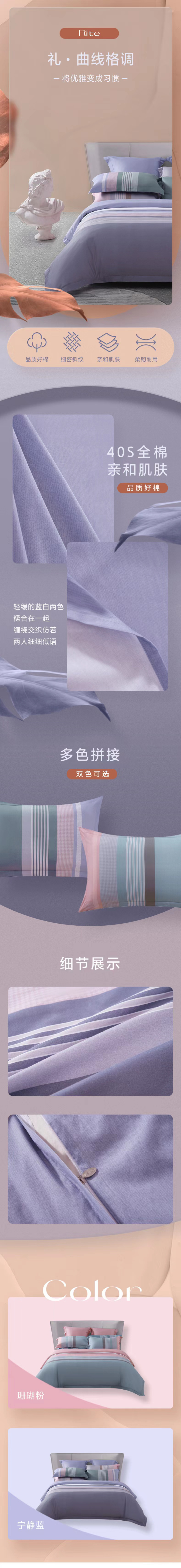 水星家纺四件套2m*2.3m宁静蓝全棉舒适 礼·曲线格调 适用于1.5m床 宝石蓝