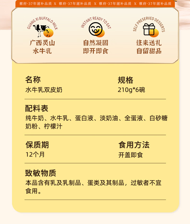 蔡府(CHAIFOO) 水牛乳双皮奶 210g*6 经典广式 黄色(单位:盒)
