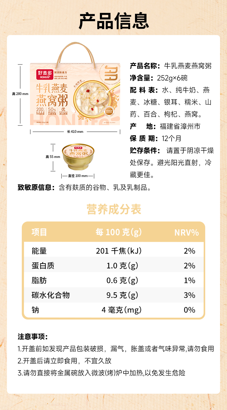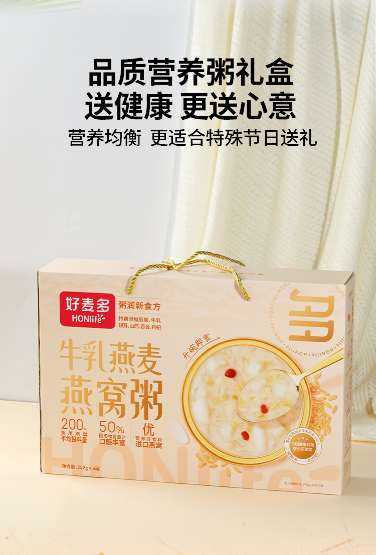 好麦多(HONlife) HYX021 牛乳燕麦燕窝礼盒252g*6碗 营养早餐送礼佳品 混色(单位:盒)