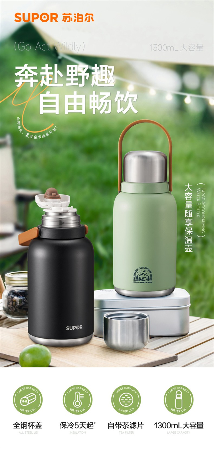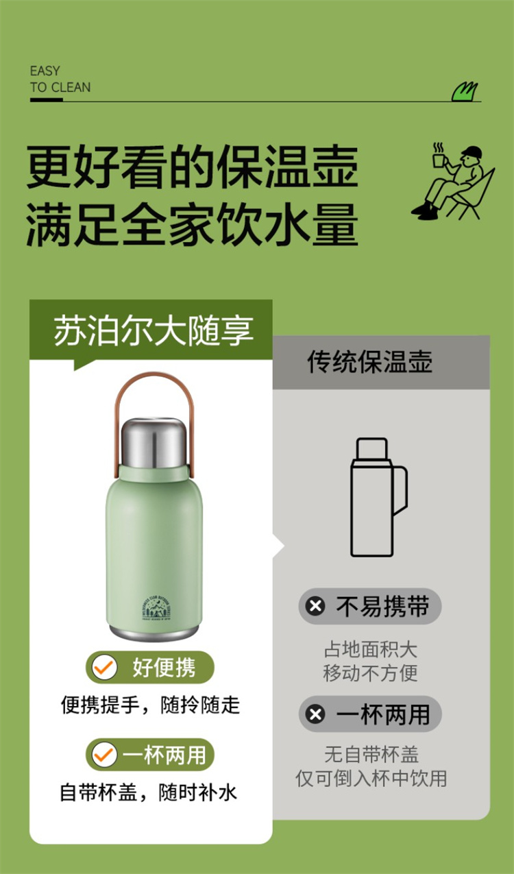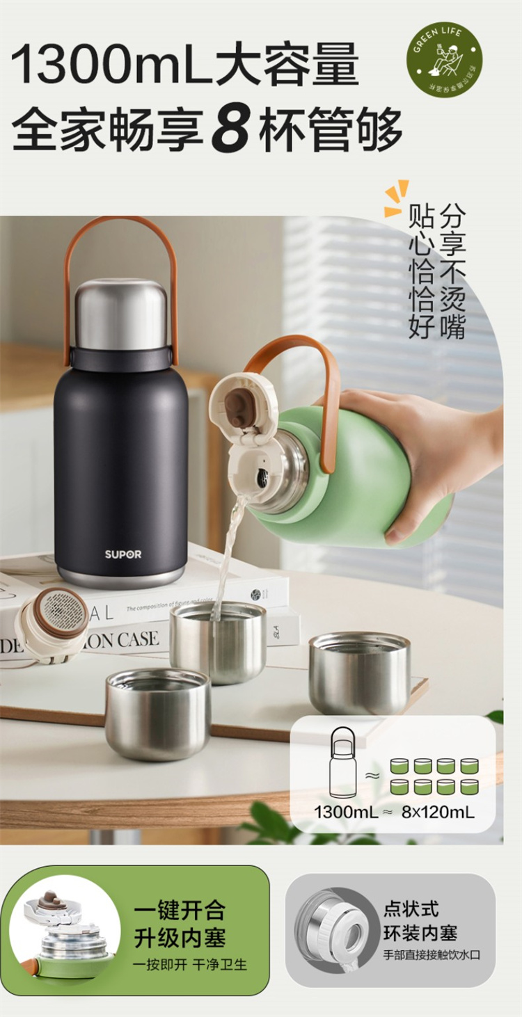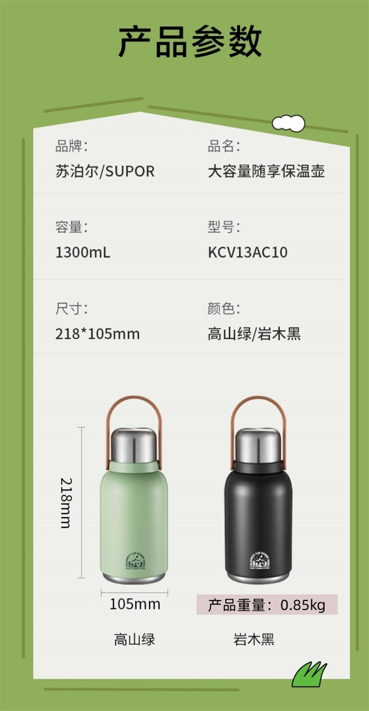 苏泊尔(SUPOR)316不锈钢 大容量随享保温壶1.3L.KCV13AC10(个) 高山绿