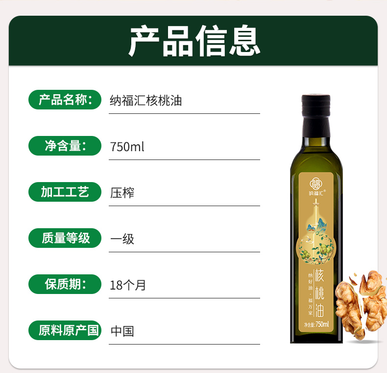 纳福汇 核桃油单瓶 G-30 750ml 橘黄色(单位:盒)