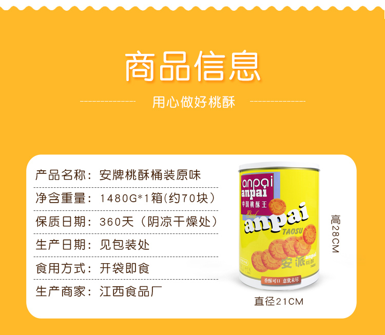 安牌 中国桃酥王1480g 传统原味(罐装+礼袋) 黄色