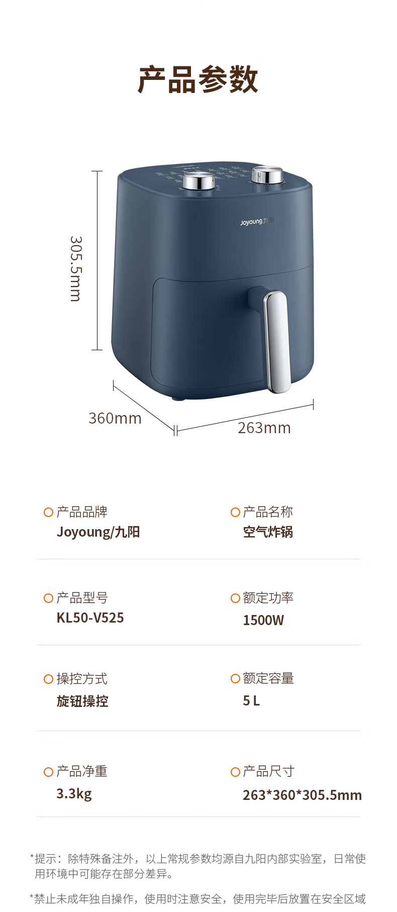 九阳(Joyoung)KL50-V525无油不用翻面5L空气炸锅(单位:台) 蓝色