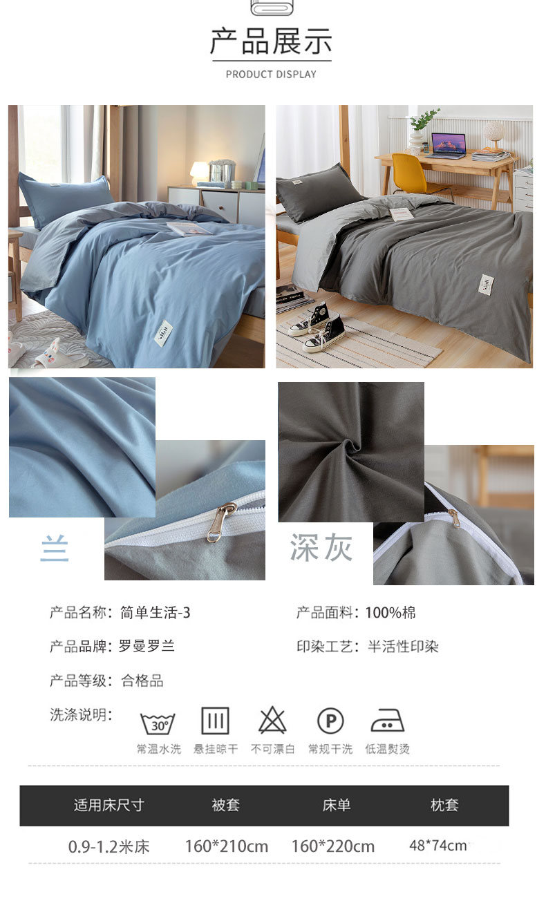 罗曼罗兰全棉三件套 简单生活160x210cm(单位:套) 深灰 1.2米