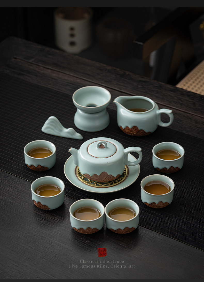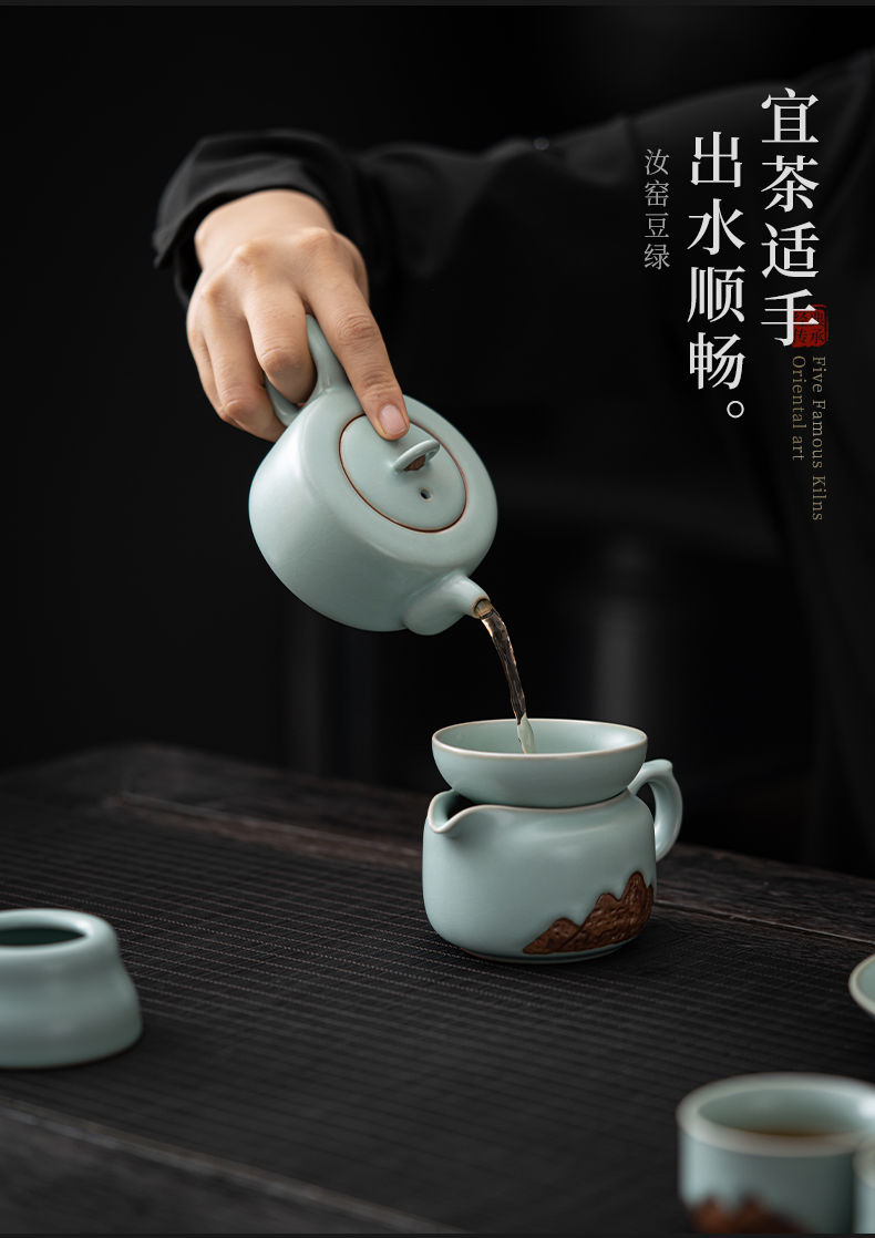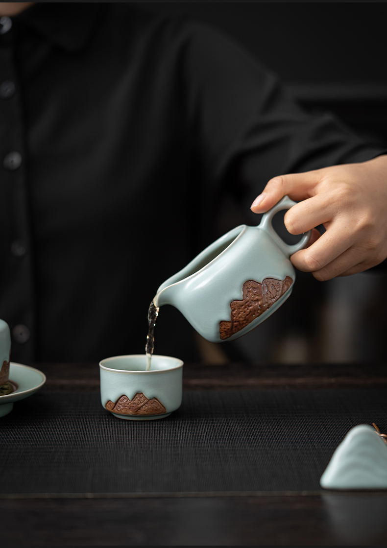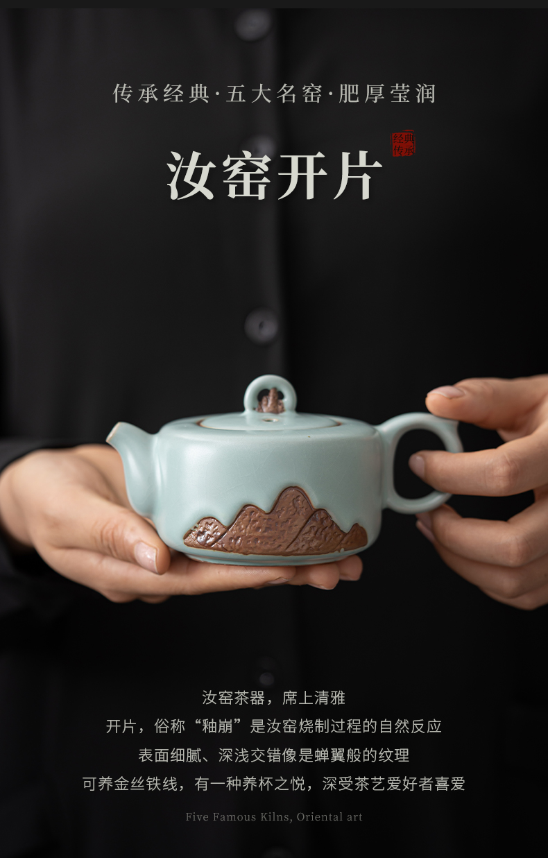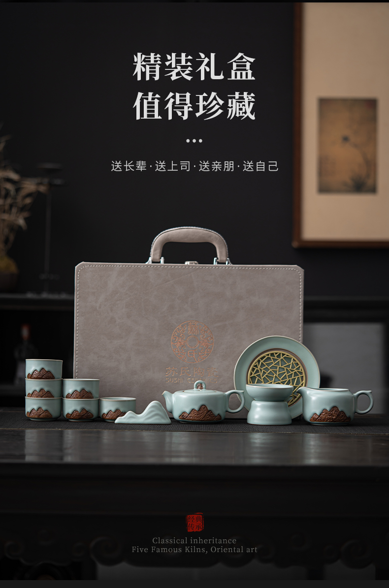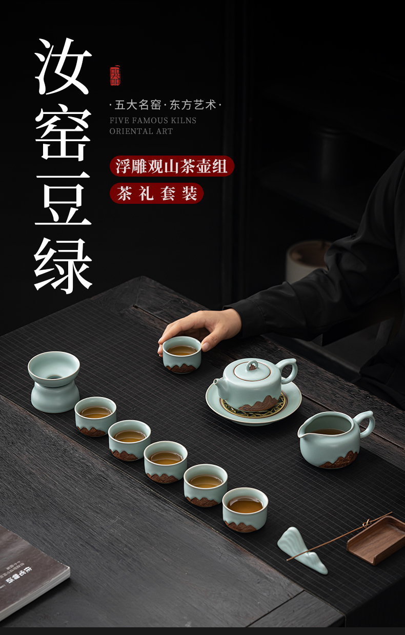 苏氏陶瓷(SUSHI CERAMICS)J0903整套茶具汝窑浮雕山行泡茶壶(单位:套) 水蓝色