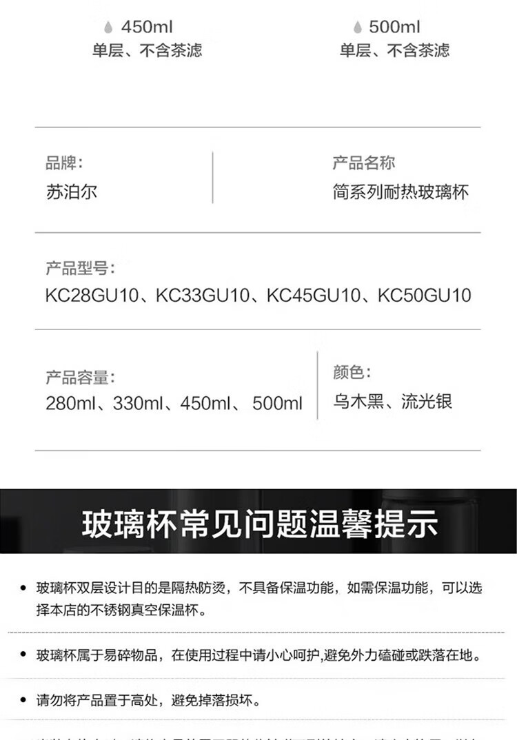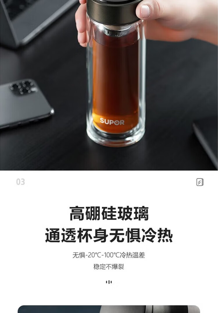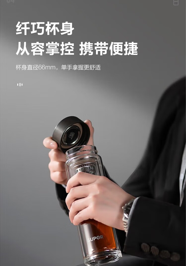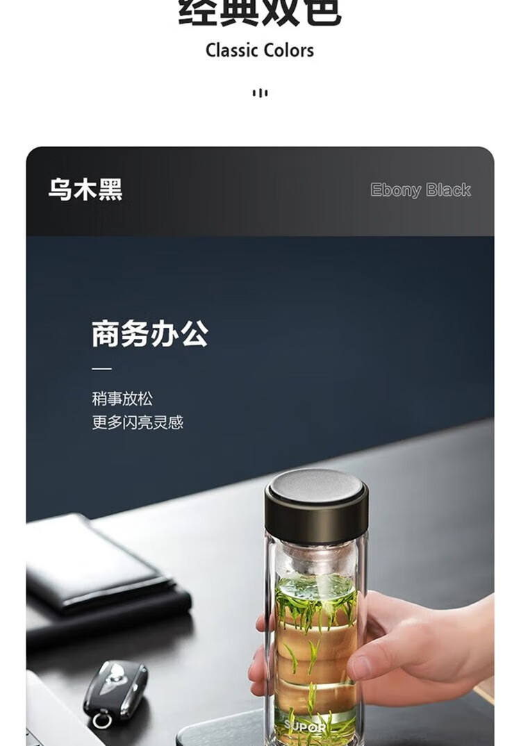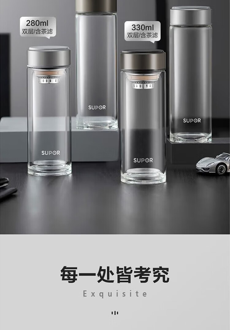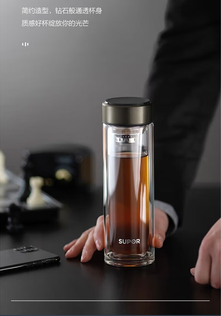 苏泊尔(SUPOR)330ml玻璃杯双层耐高温防烫车载水杯KC33GU10(单位:个) 乌木黑