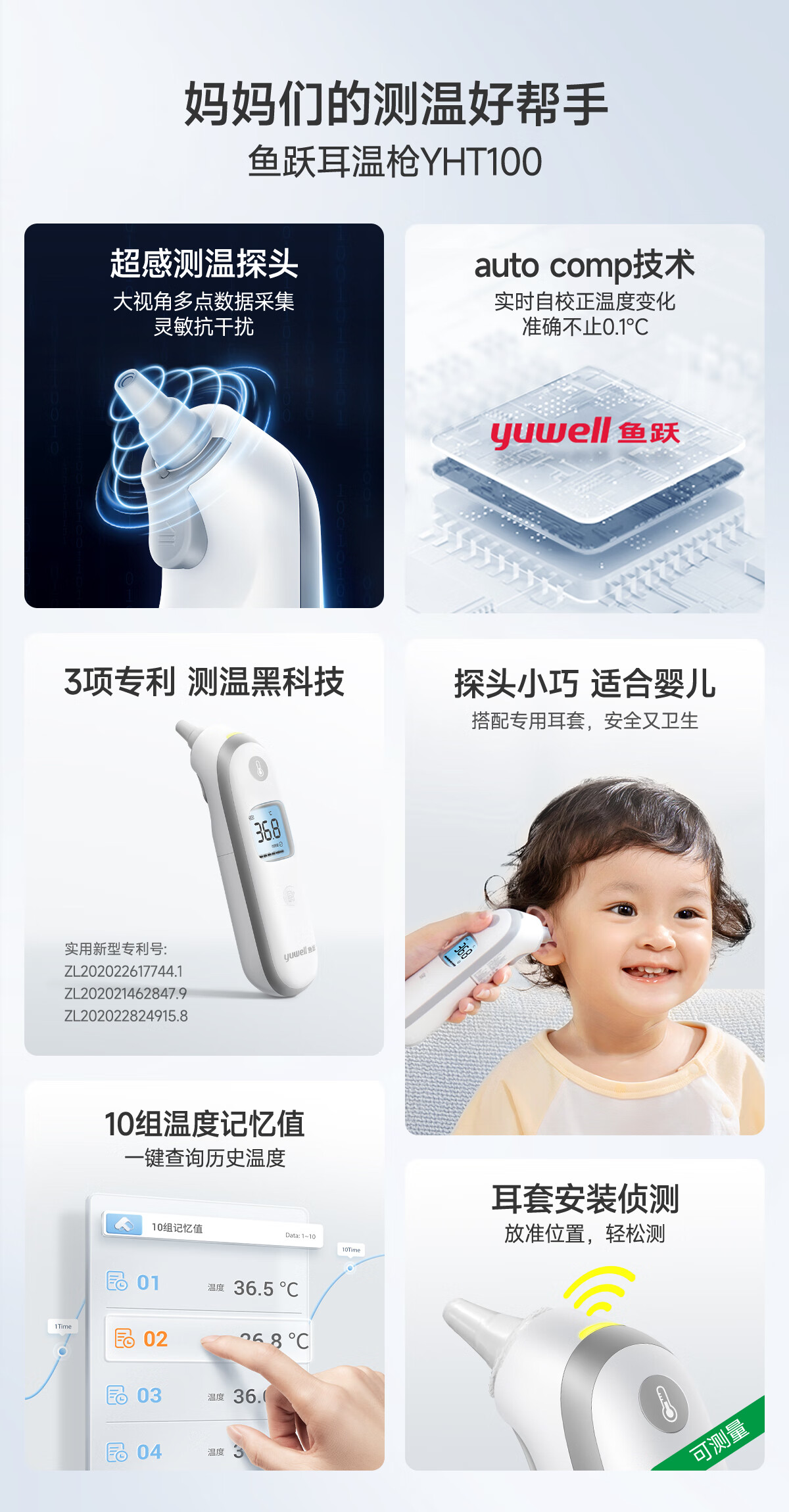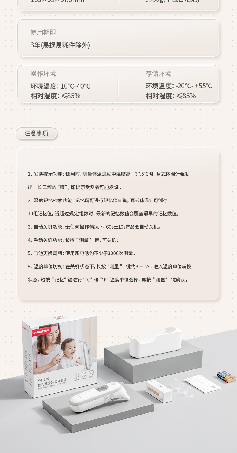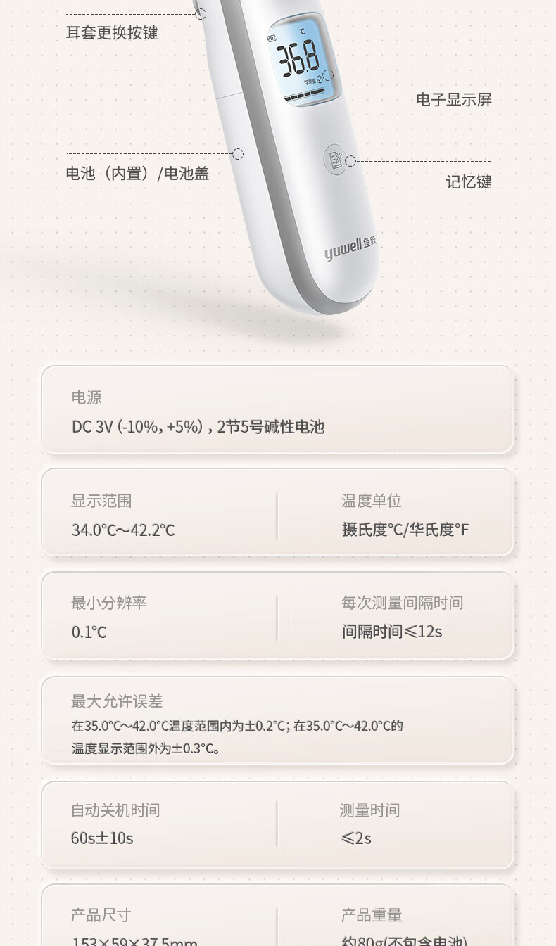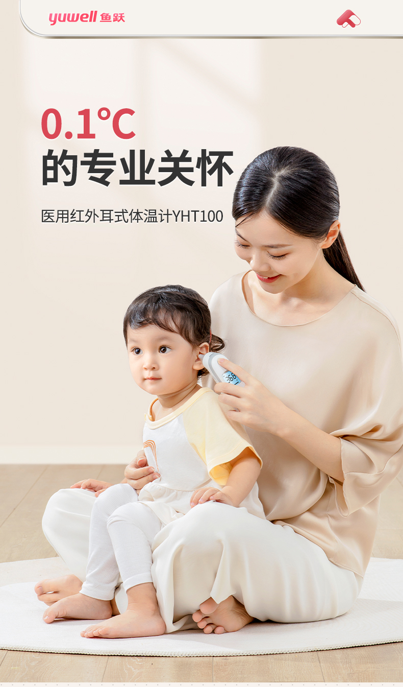 鱼跃(Yuwell) YHT100 入耳式 红外耳温枪体温计 白色(单位:台)