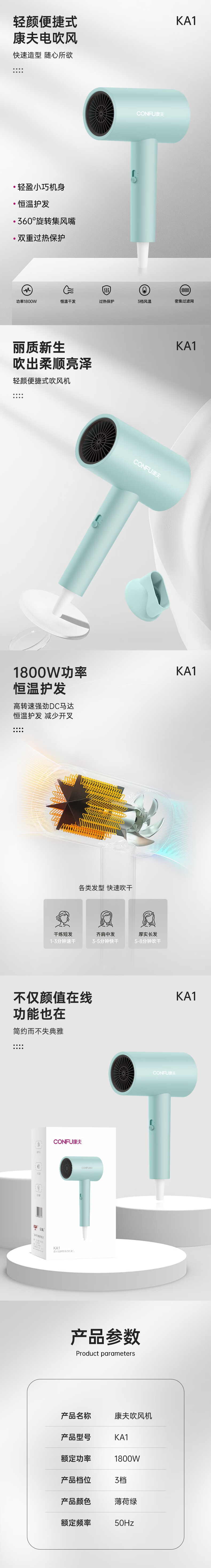 康夫(KANGFU) KA1 1800W 大功率电吹风机 薄荷绿(单位:台)