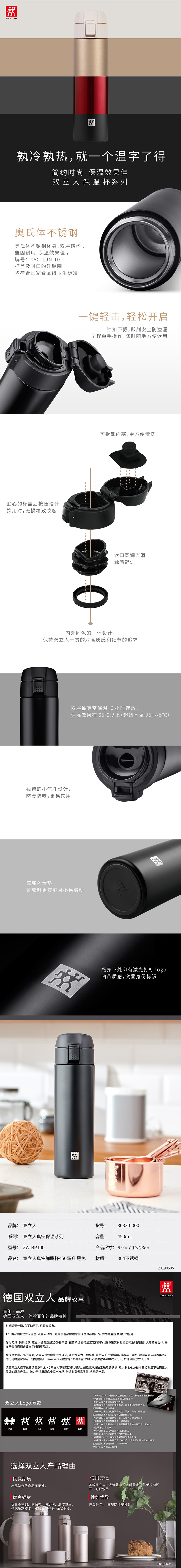 双立人真空弹跳杯450毫升 黑色 ZW-BP100 黑色