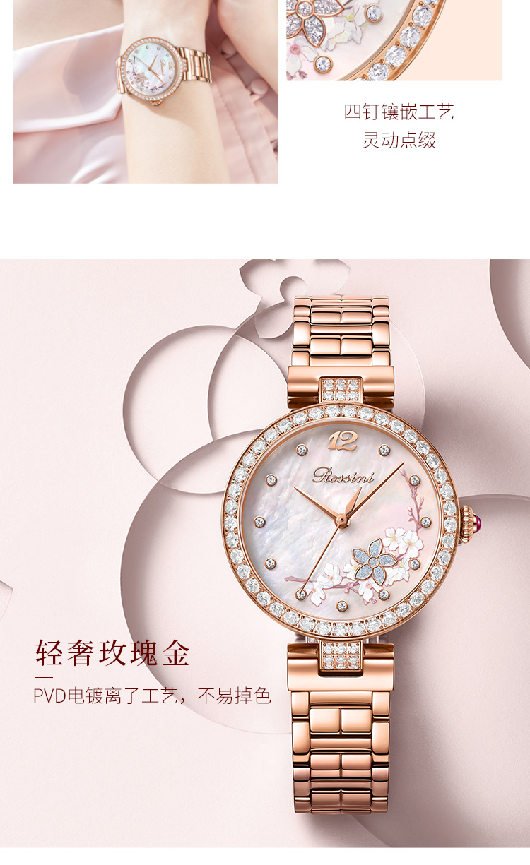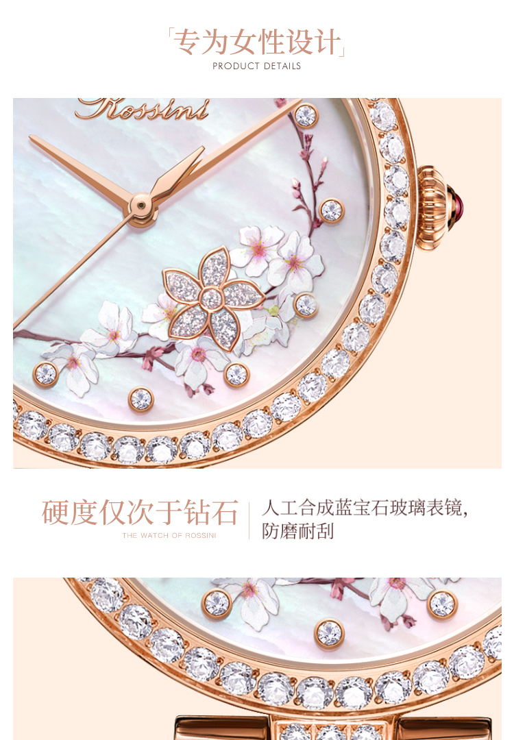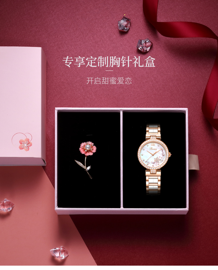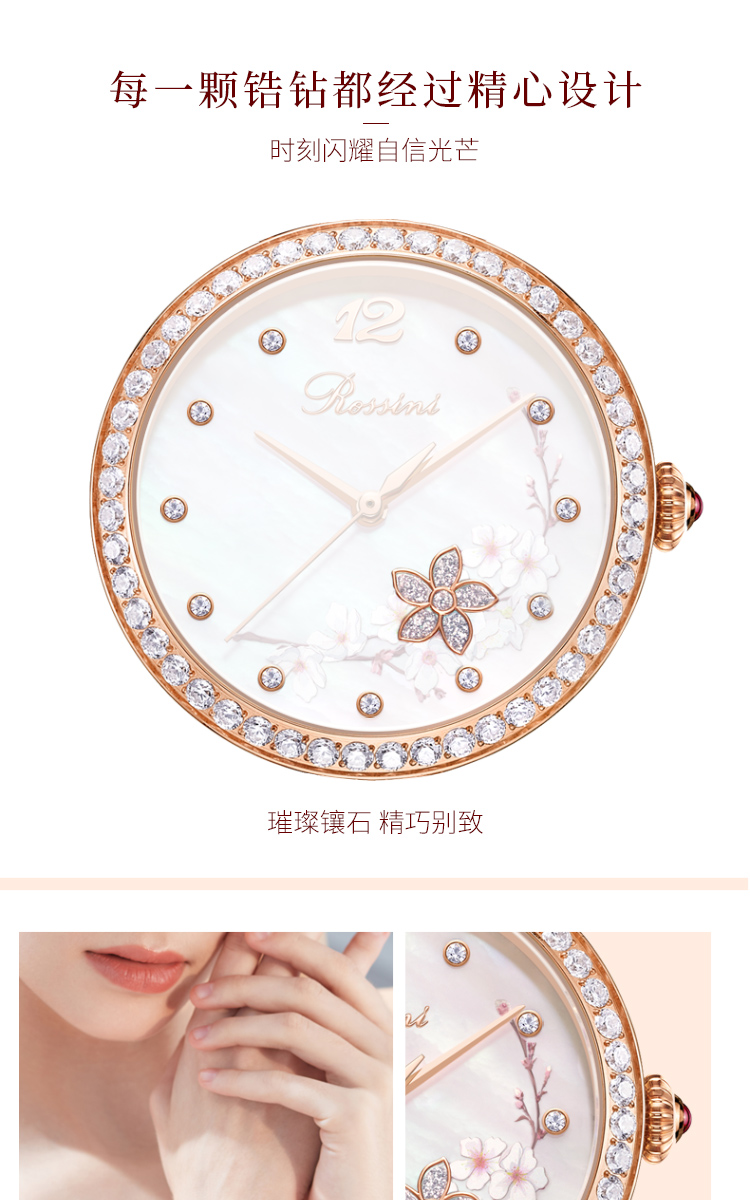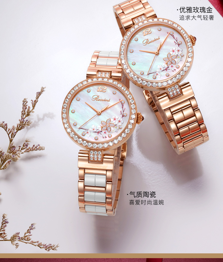 Rossini罗西尼典美系列自动机械手表桃花贝母盘间玫瑰金陶瓷带5978G01B 赠桃花胸针礼盒 只 玫瑰金