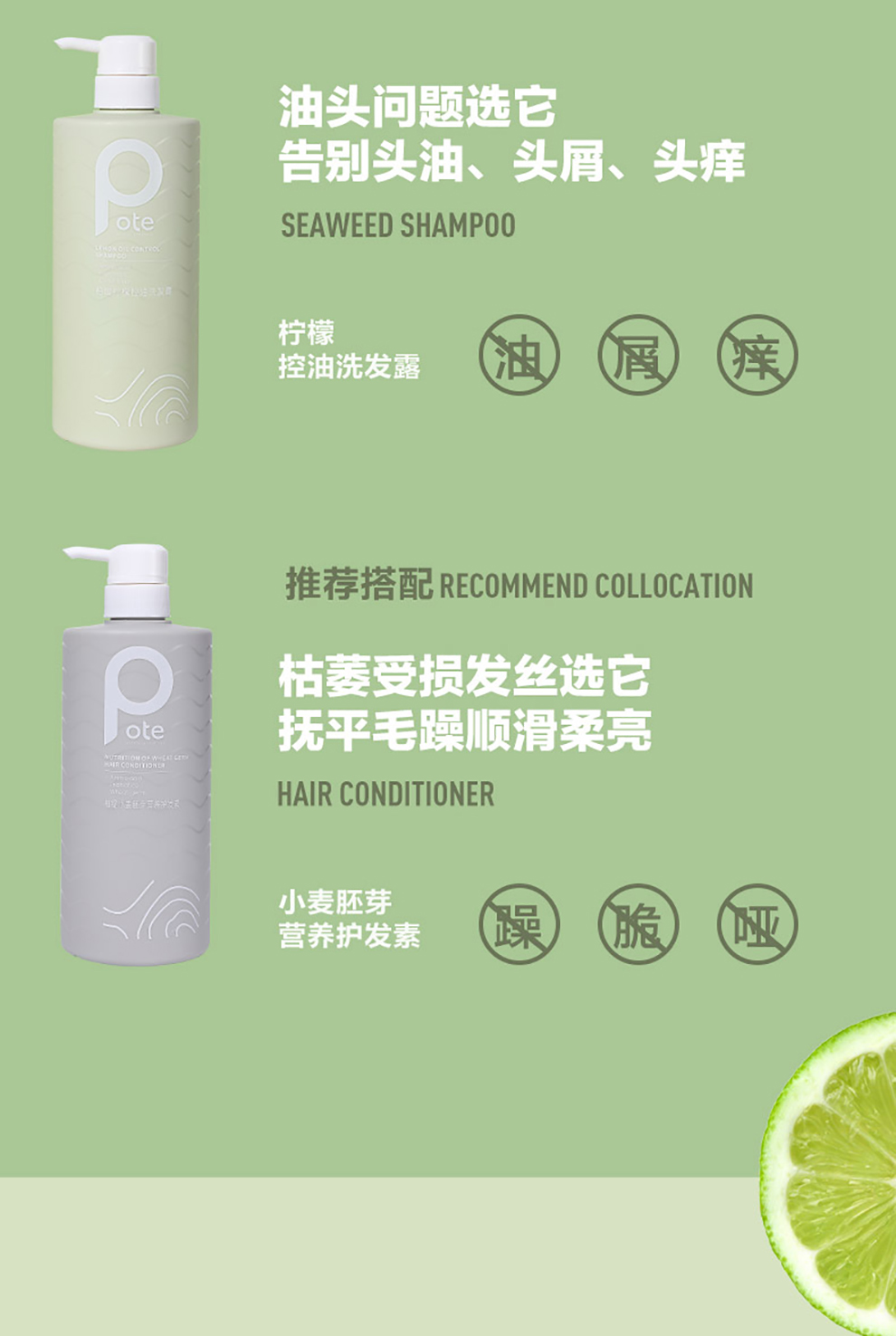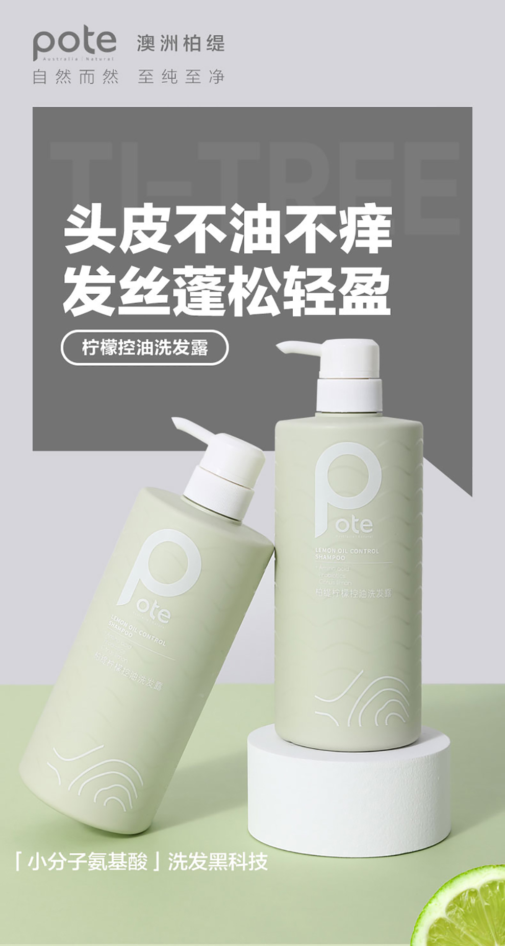 柏缇(pote)控油洗发水男 氨基酸去屑止痒蓬松洗头膏女 持久留香洗发露 (柠檬控油洗发露780ml) 绿色 绿色