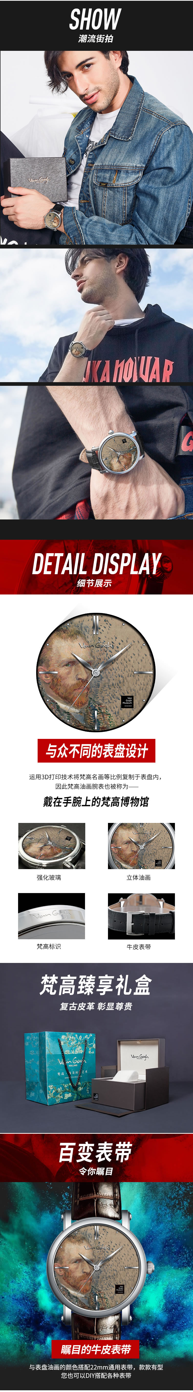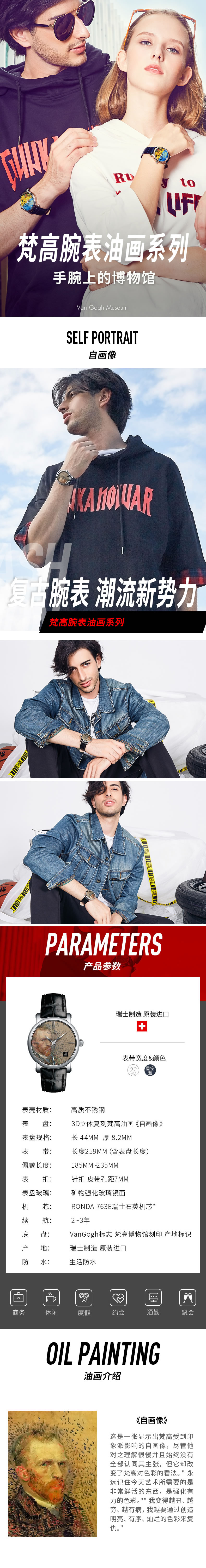 梵高(VanGogh)瑞士手表男 3D油画表面牛皮表带时尚休闲潮牌博物馆正版原装进口 明星同款 自画像 黑色