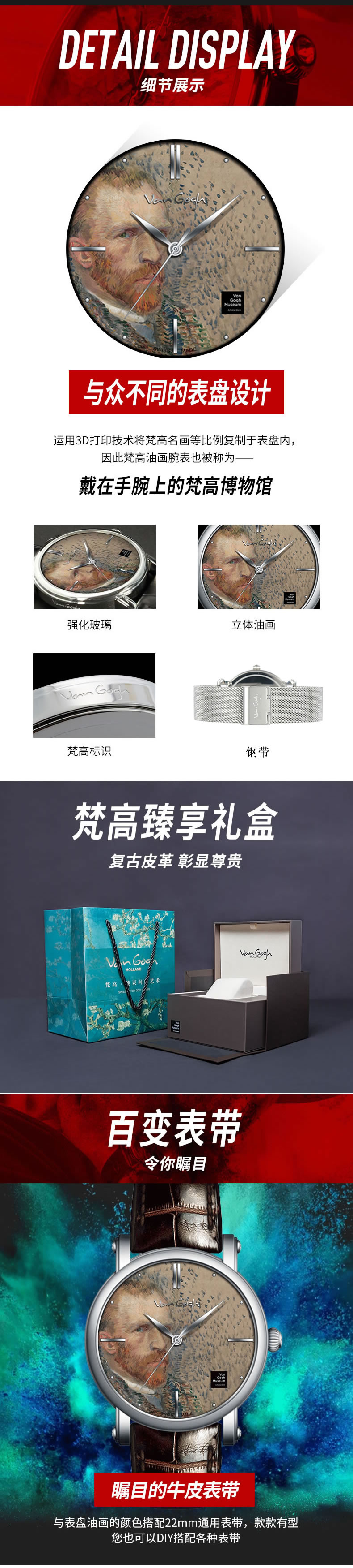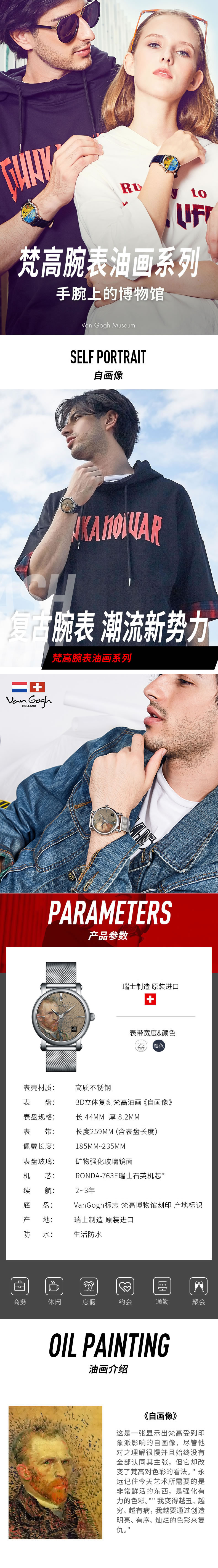 梵高(VanGogh)瑞士手表男 3D油画表面钢带时尚休闲潮牌博物馆正版原装进口 明星同款 自画像 银色