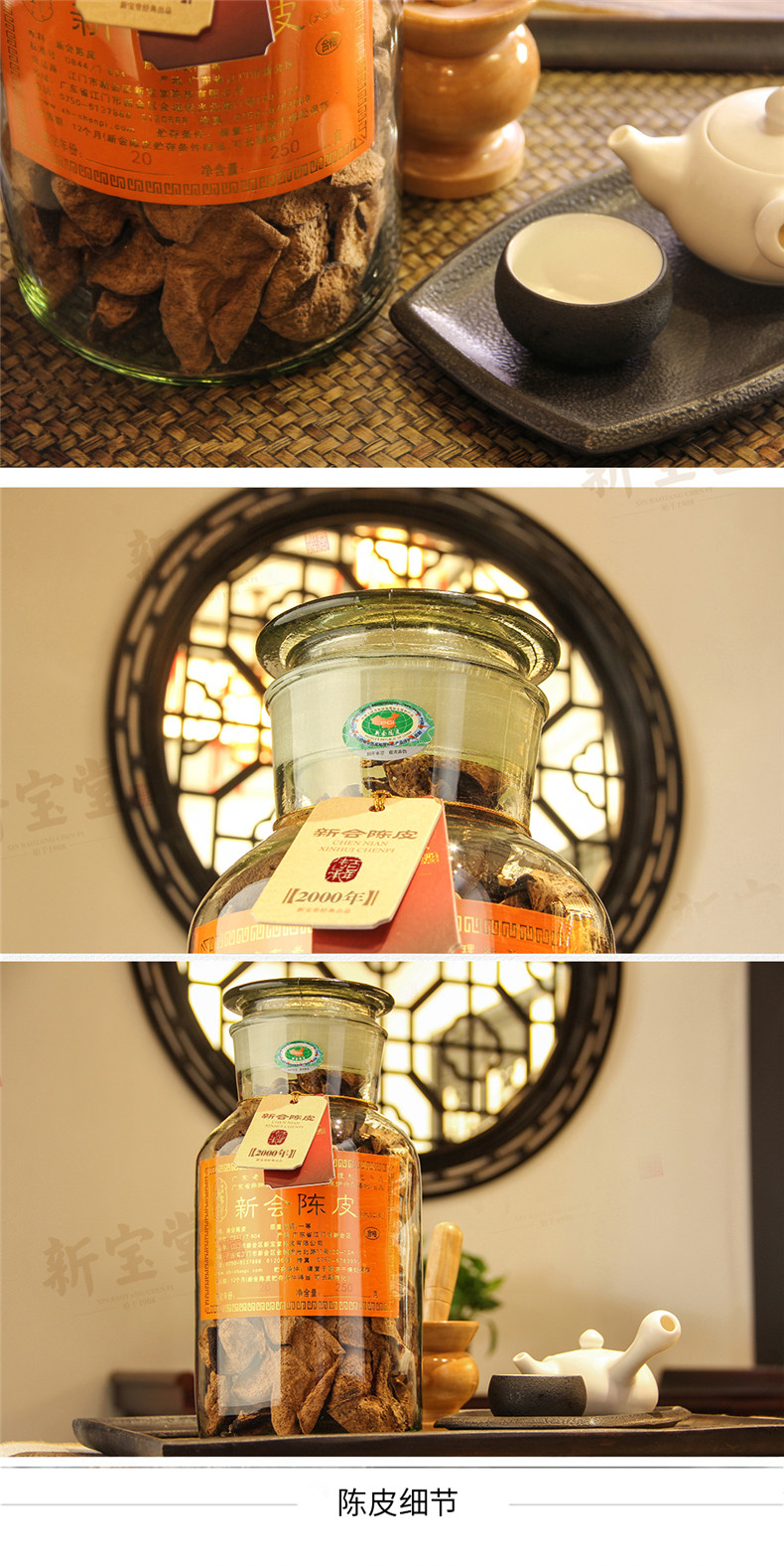 新宝堂新会陈皮二十年老陈皮干蕴月瓶礼盒20年陈皮泡茶送礼玻璃瓶礼盒250克