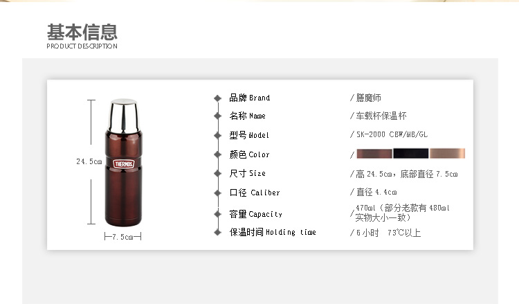 膳魔师(THERMOS) 真空不锈钢保温杯子弹头车载便携水杯 SK-2000 蓝色