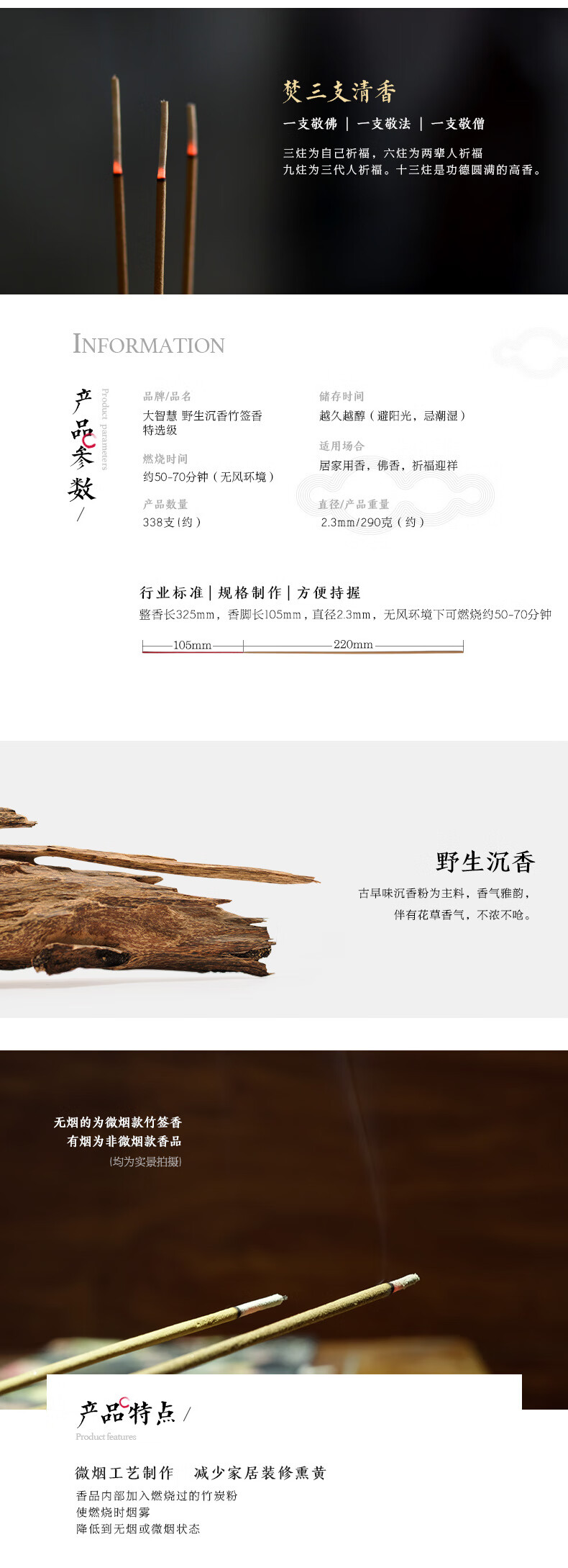 大智慧 沉香供佛香拜拜香竹签香 特选级野生沉香338支 1盒