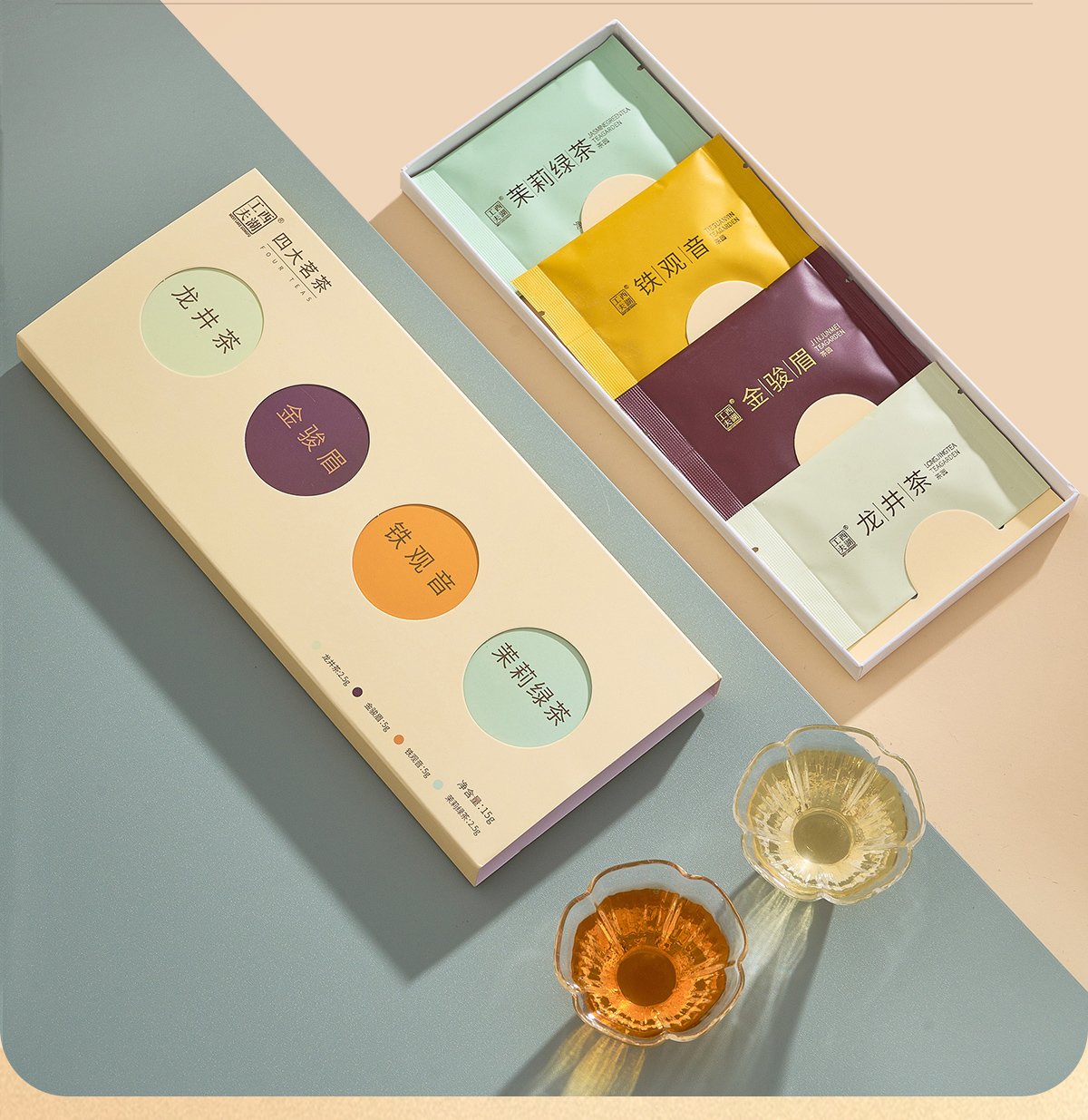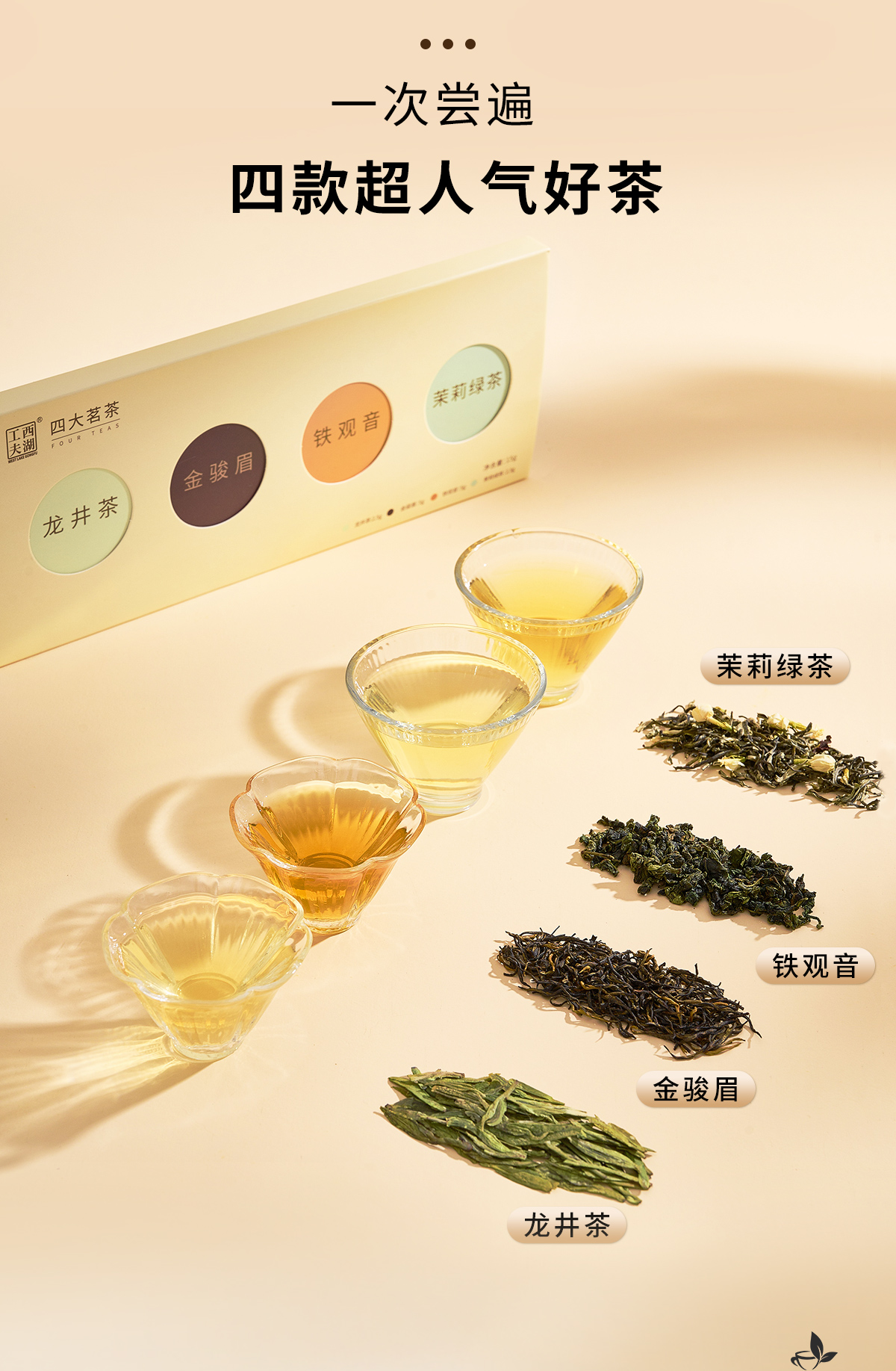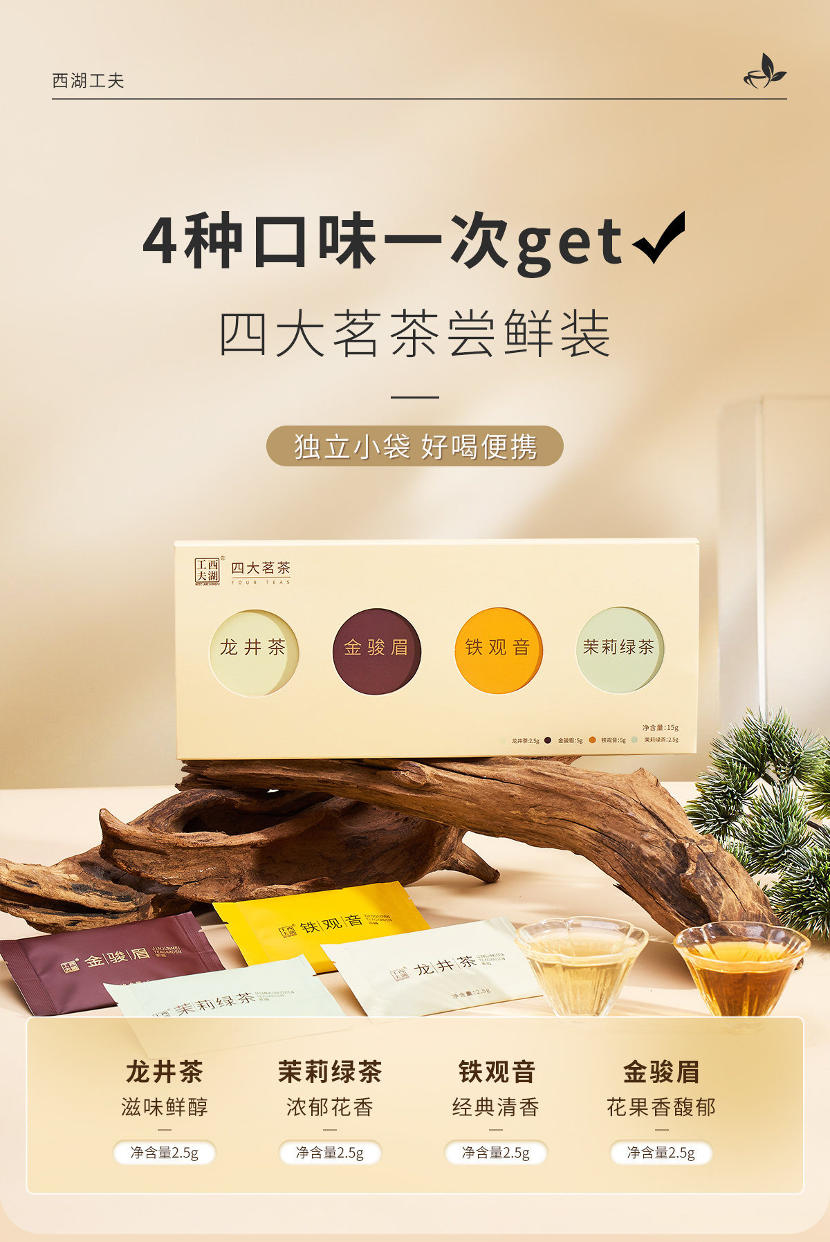 西湖工夫四大茗茶组合装龙井茶铁观音金骏眉茉莉绿茶特级15g 1盒