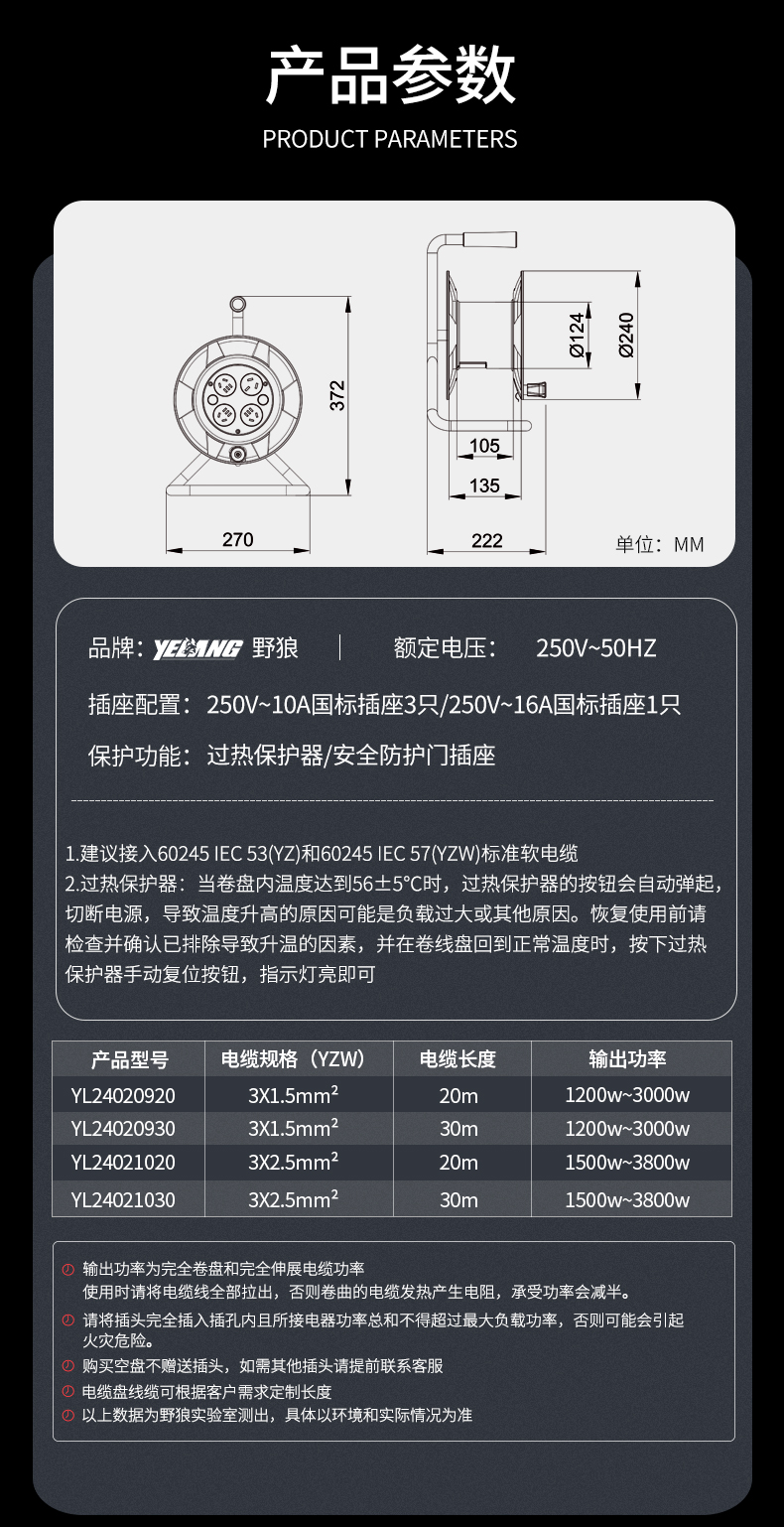 野狼YELANG/YL24021020/YZW 3*2.5*20米250V10A国标电缆盘/只 红色