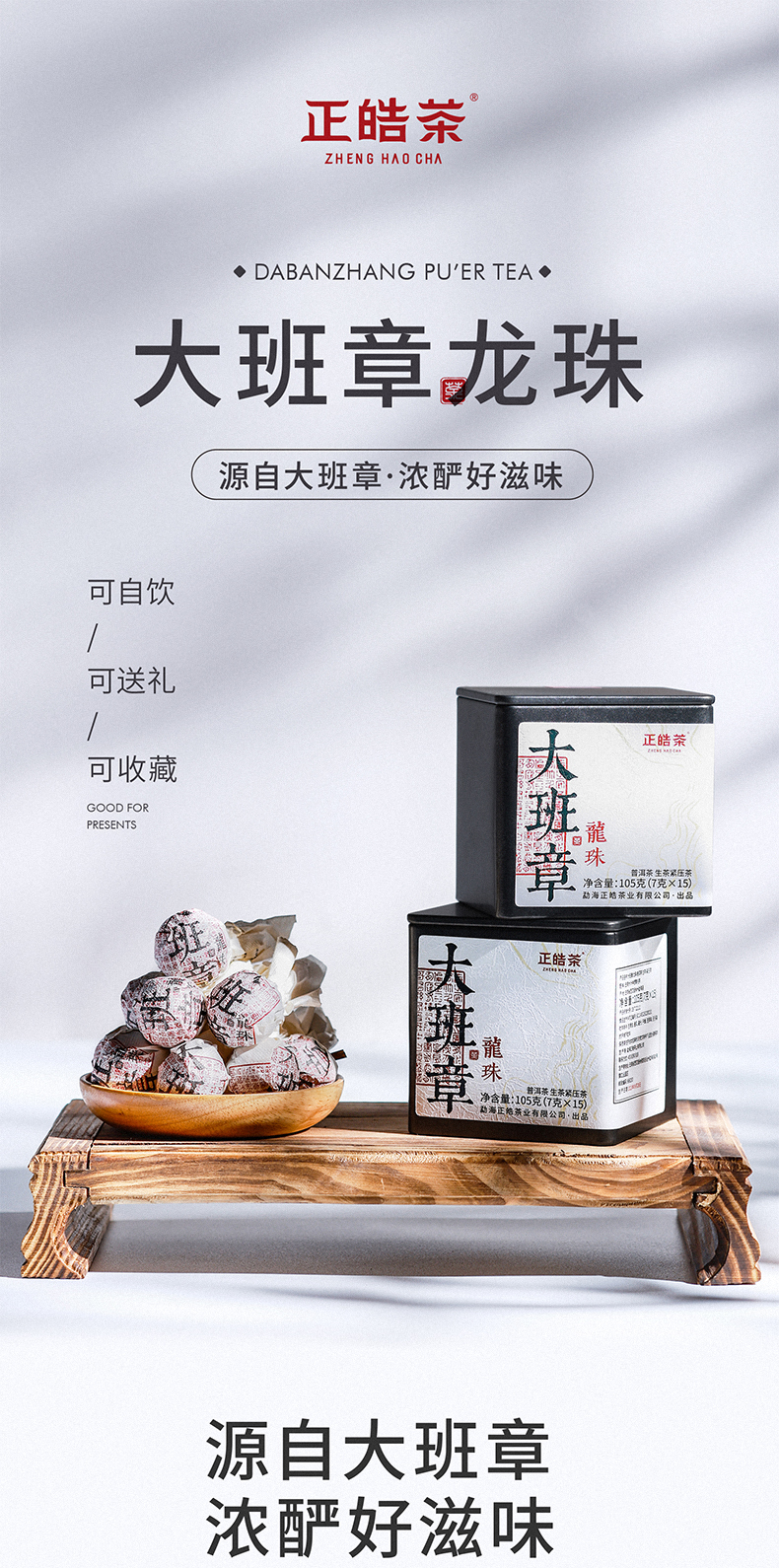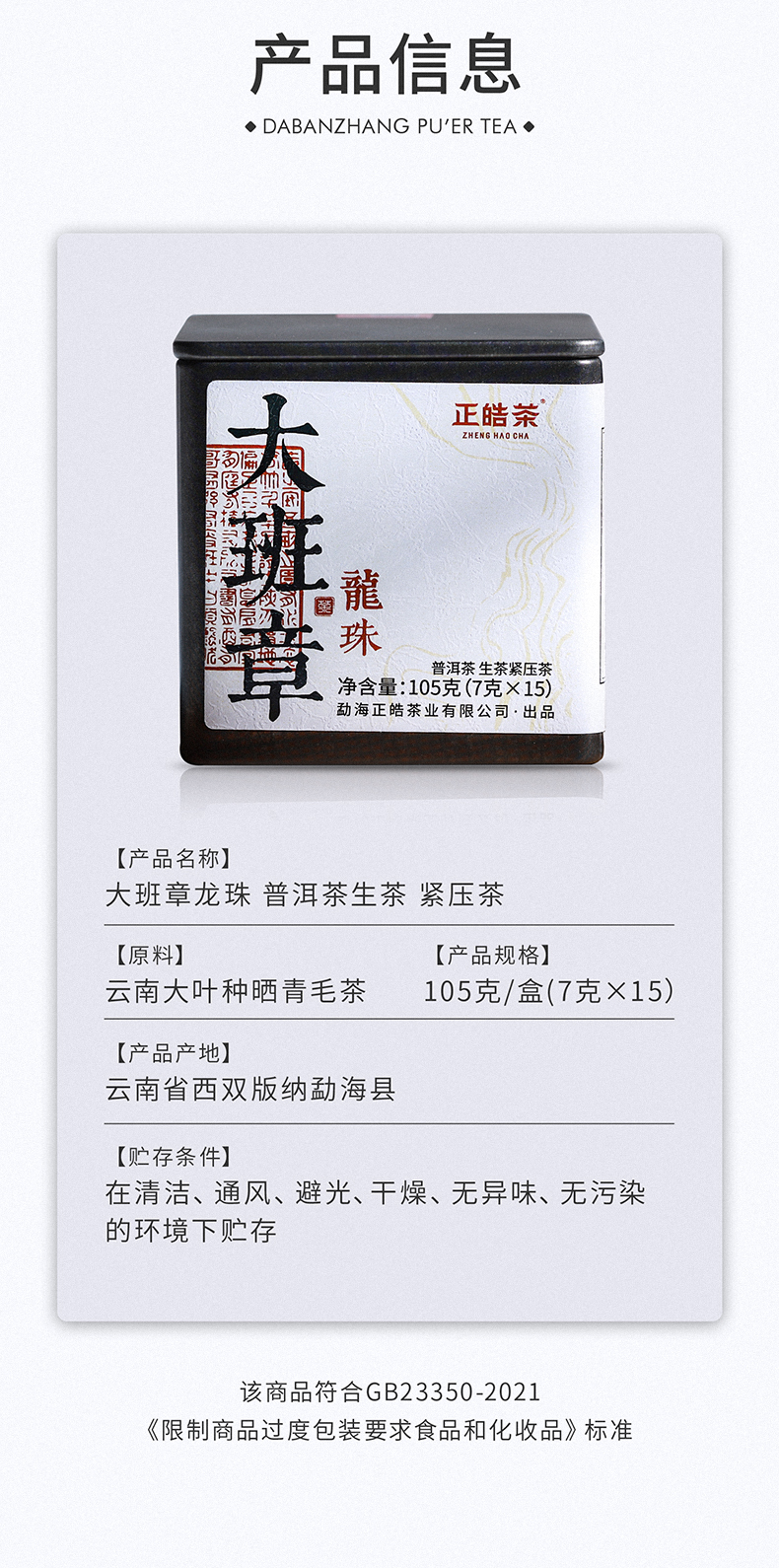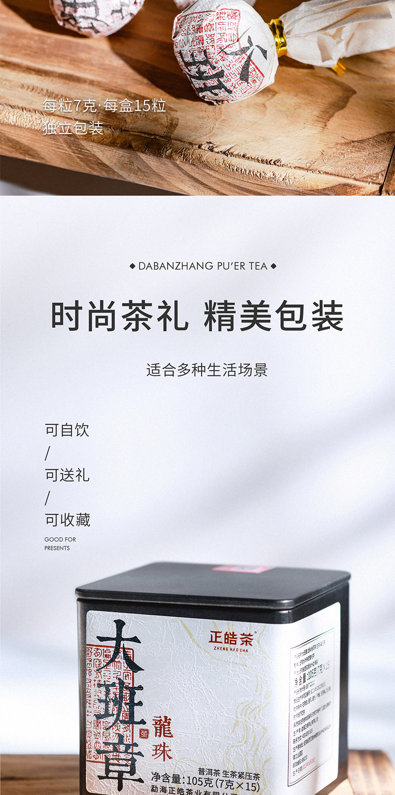 正皓茶 大班章龙珠 勐海普洱茶生茶2021年小沱茶紧压茶口粮茶铁罐装105g/盒 单位:盒 浅灰色
