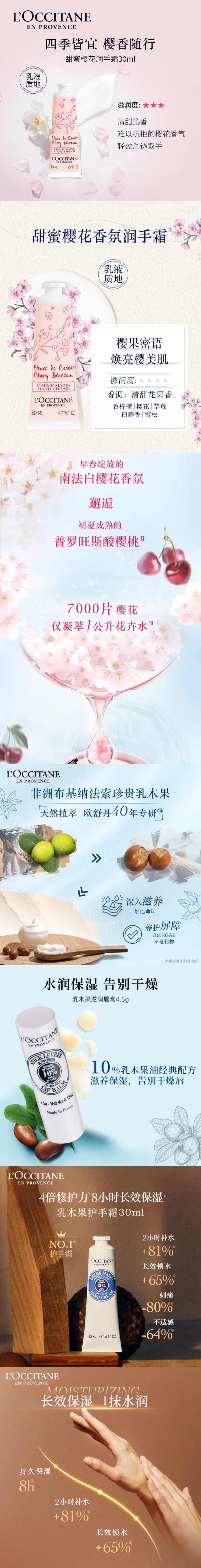 欧舒丹(L'OCCITANE) 经典 乳木果护手霜30ml+樱花护手霜30ml+唇膏4.5g 修护套装 粉色(单位:套)