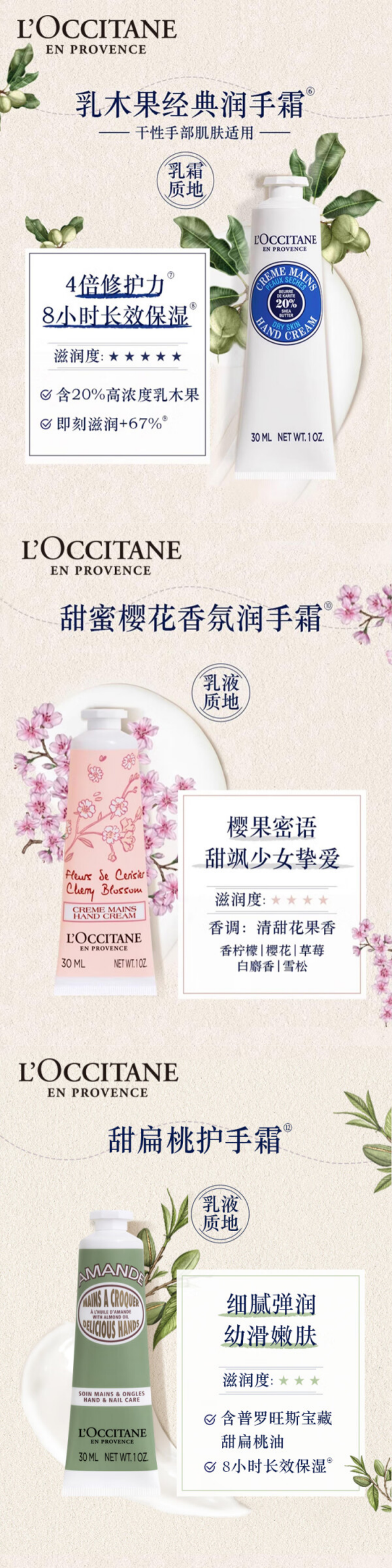 欧舒丹(L'OCCITANE) 经典 樱花30ml+乳木果30ml+甜扁桃30ml 护手霜礼盒 混色(单位:套)