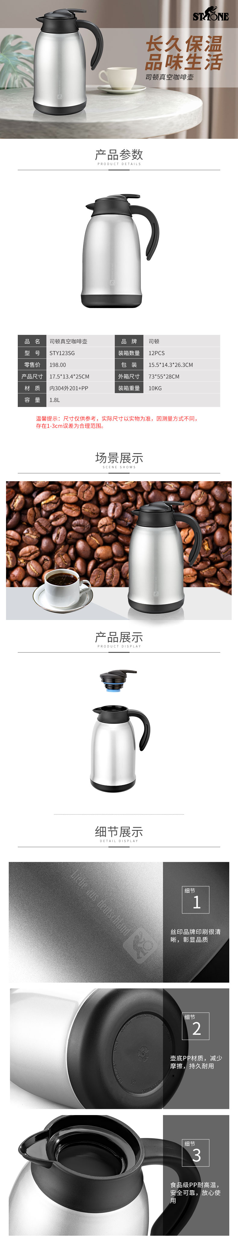 司顿 真空保温咖啡壶 STY123SG(单位:个) 不锈钢色