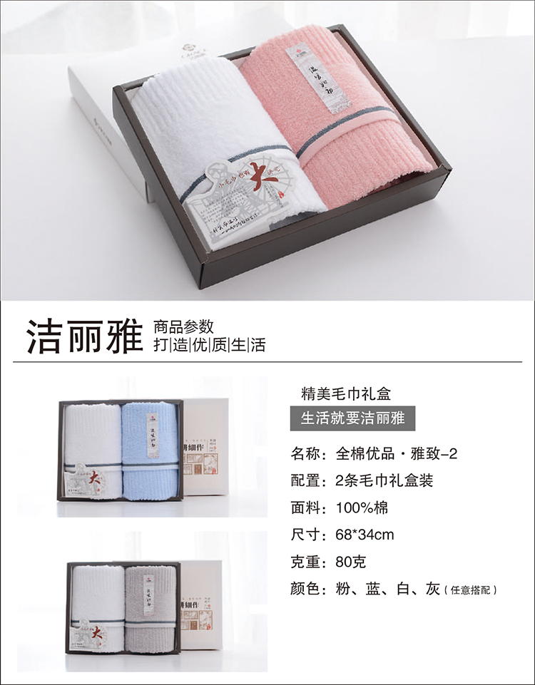 洁丽雅 全棉优品·雅致-2 2条面巾巾耕细作礼盒装 粉色