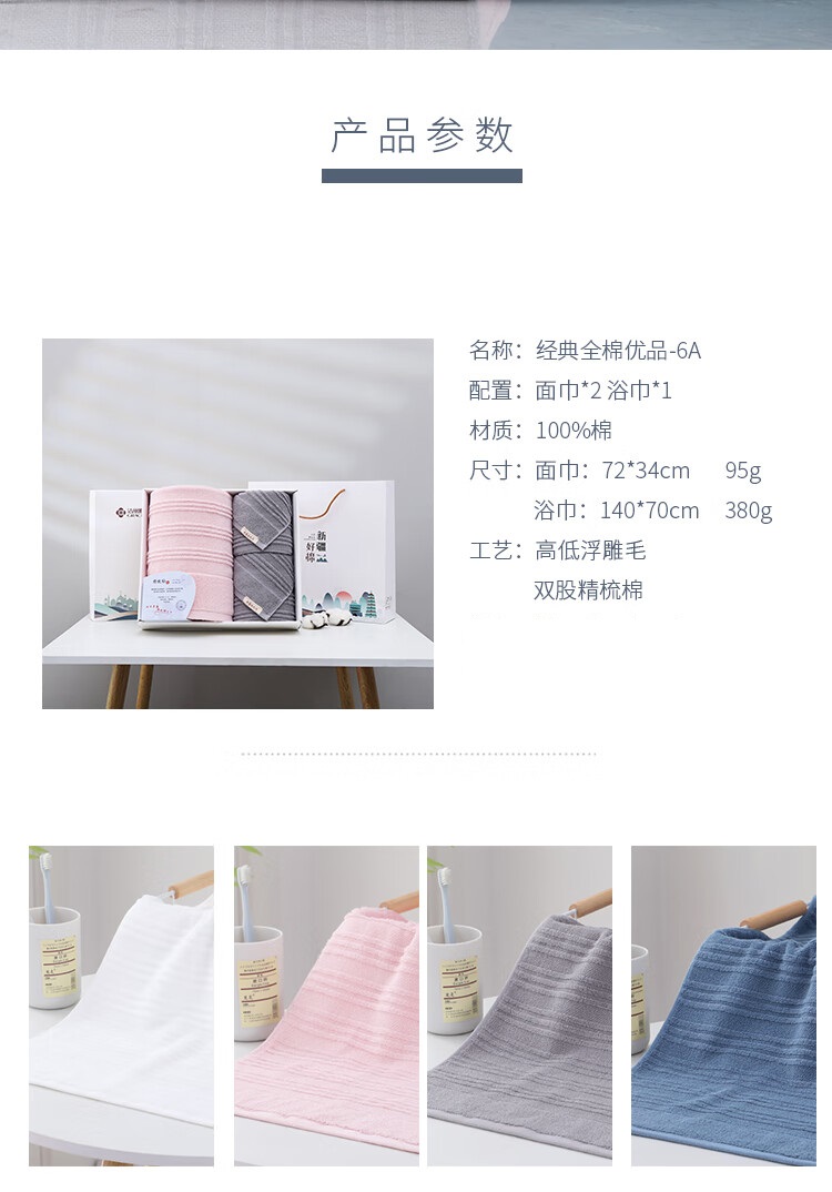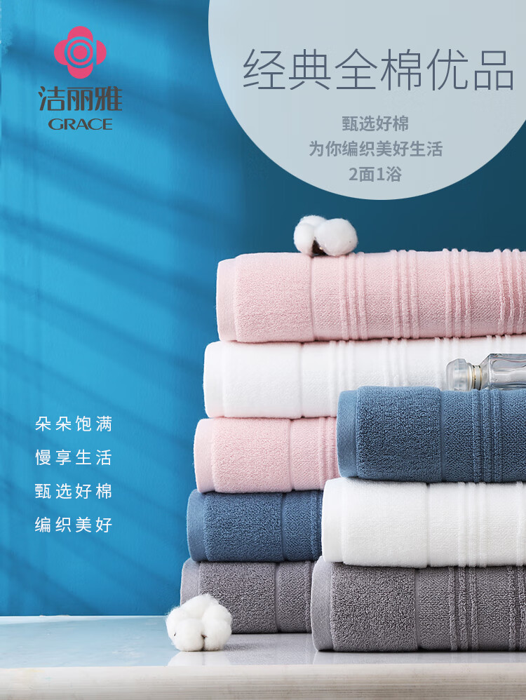 洁丽雅(Grace)经典全棉优品-6A 面巾2条浴巾1条 礼盒+提袋装 随机