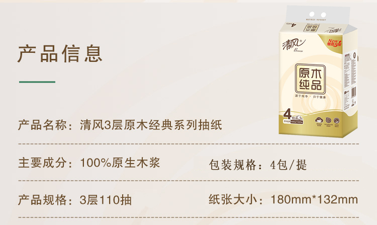 清风纯品抽纸3层110抽4包提装BR43NC-04E(单位:提) 白色