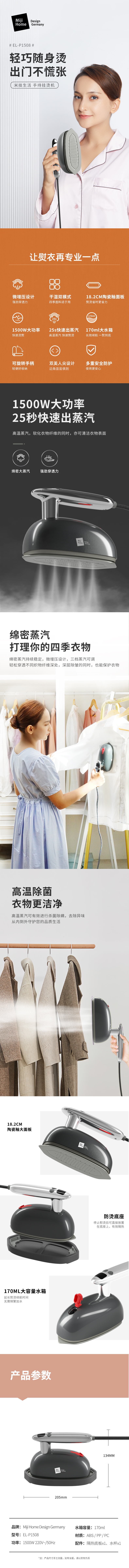 米技 手持挂烫机电熨斗绵密蒸汽高温除菌 1500W EL-P1508 套 深空灰