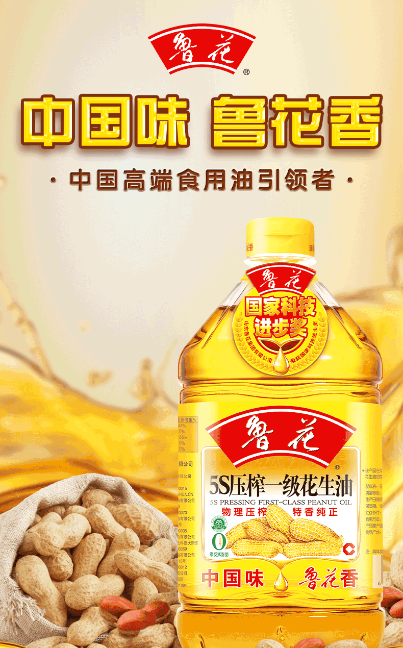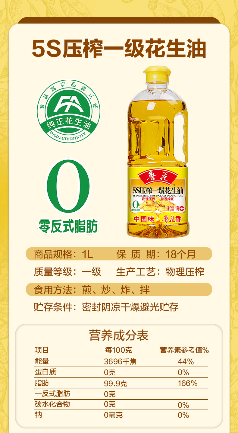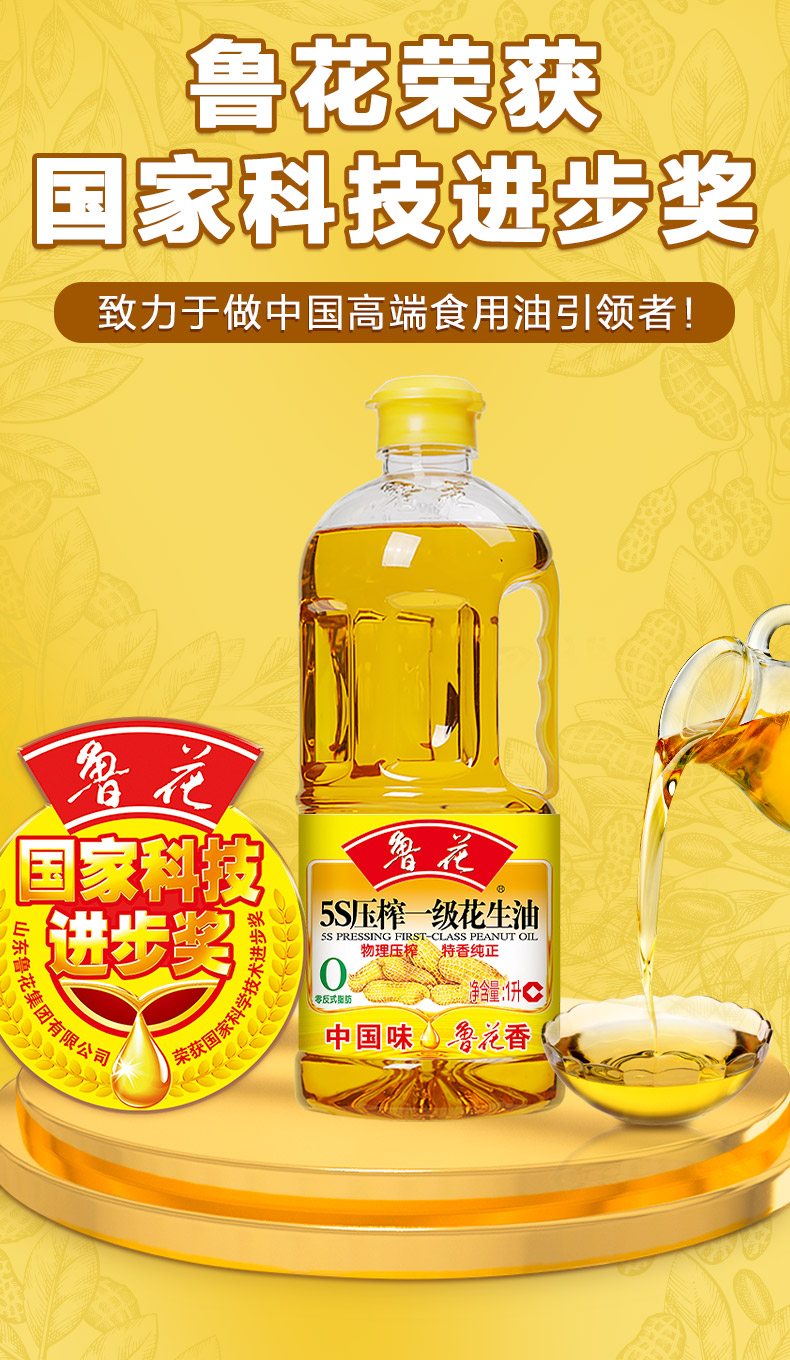鲁花 5S压榨花生油 1L 物理压榨工艺 香槟黄(单位:桶)