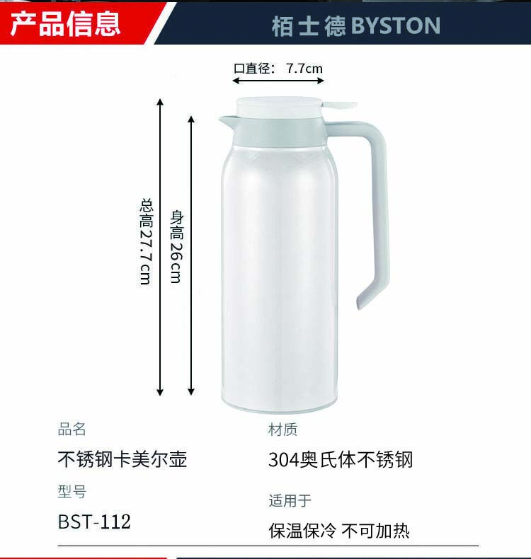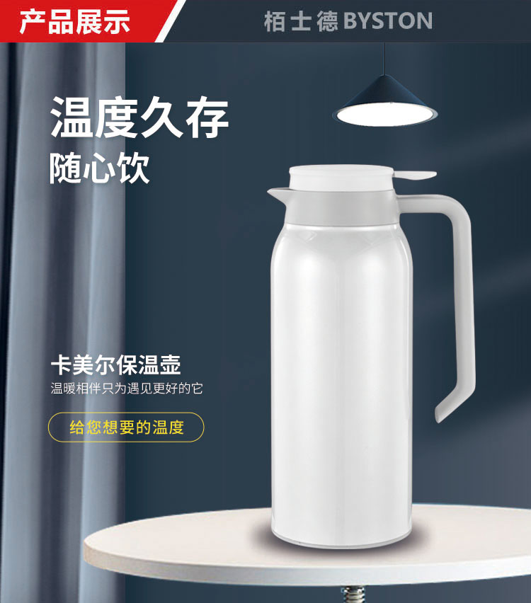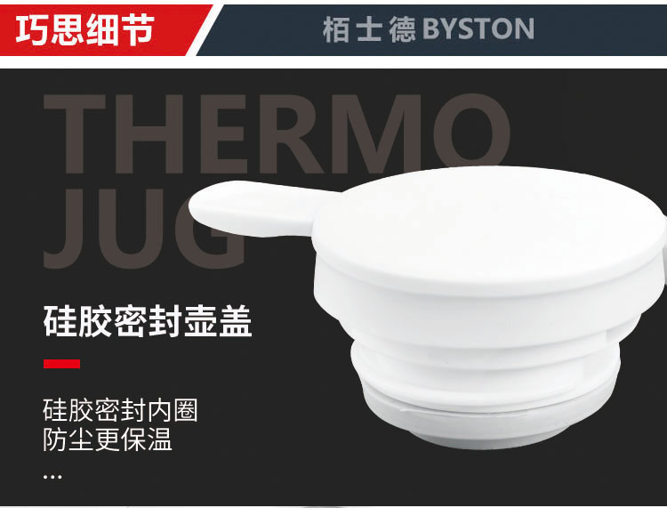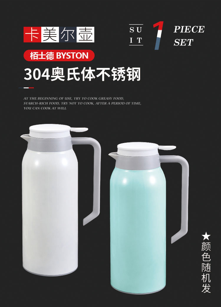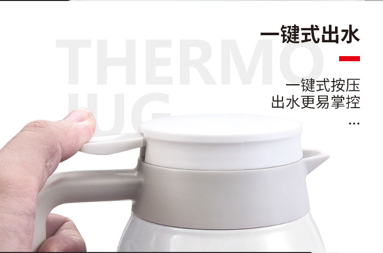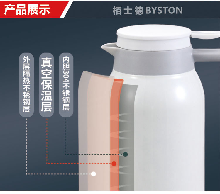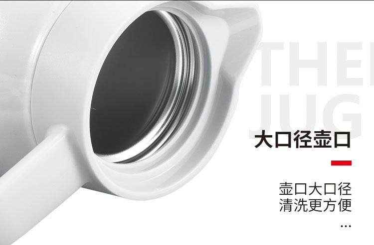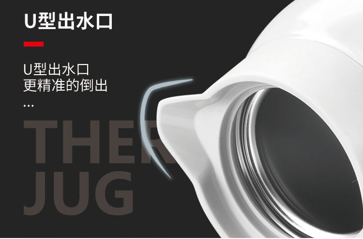 产品采用食品级304不锈钢,真空保温层,外层隔热不锈钢层,温度持久更安全;壶盖使用硅胶密封内圈防尘更保温;壶口大口径,清洗更方面;一体式手柄,隔热防烫握感更舒适;一键式按压,出水更易掌控;U型出水口,更精准的倒出;底部防碰撞设计,不再担心刮花底部。
