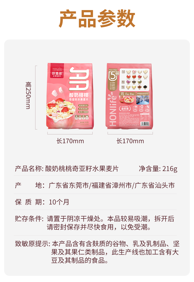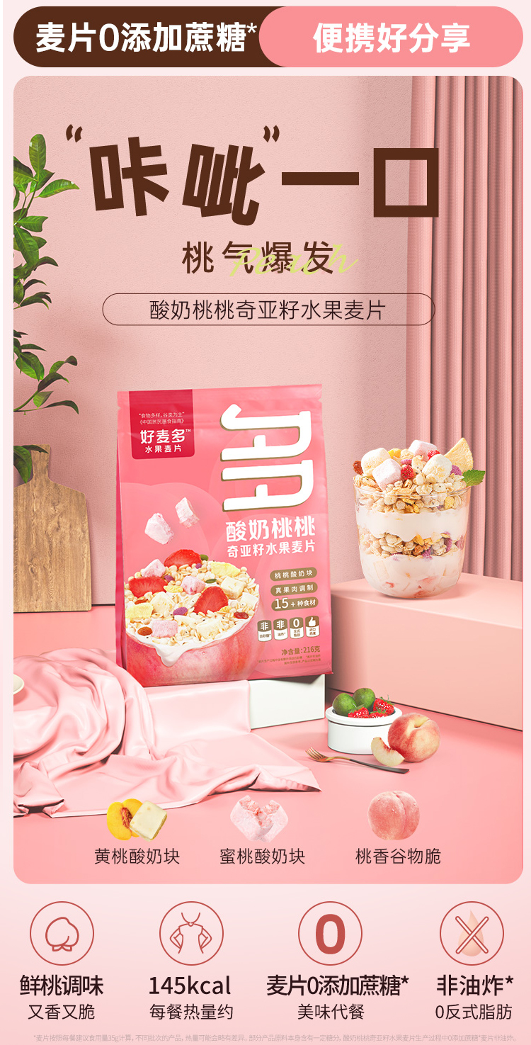 好麦多 酸奶桃桃奇亚籽水果麦片216g轻卡早餐代餐(单位:袋) 粉色