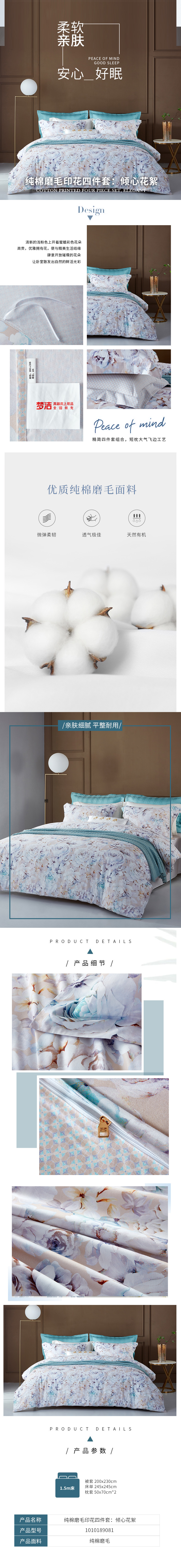 梦洁纯棉磨毛印花四件套:倾心花絮200*230cm 花色