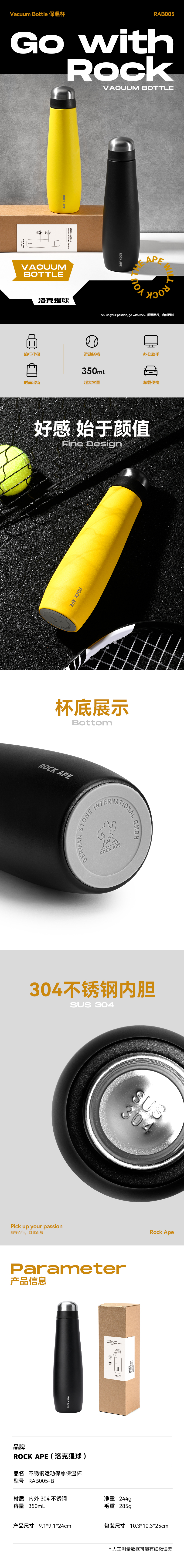洛克猩球 不锈钢运动保冰保温杯 RAB005-B(单位:个) 黑色