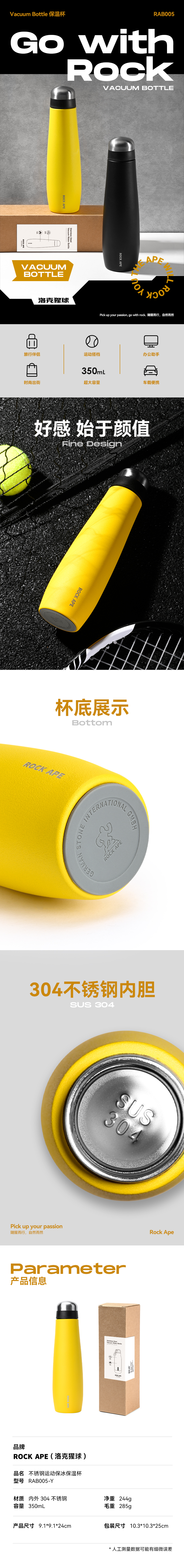 洛克猩球 不锈钢运动保冰保温杯 RAB005-Y(单位:个) 黄色