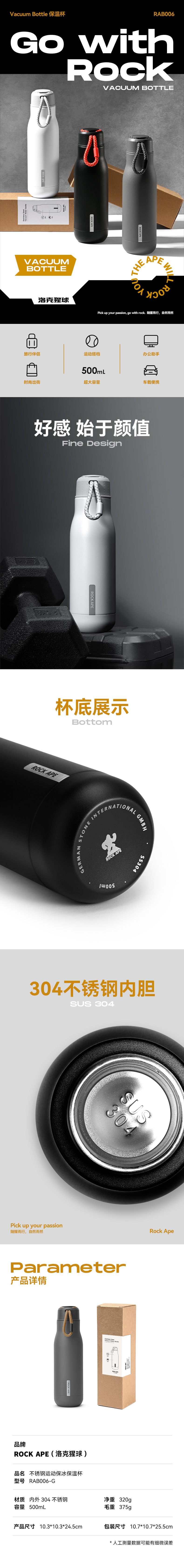 洛克猩球 不锈钢运动保冰保温杯 RAB006-G(单位:个) 灰色