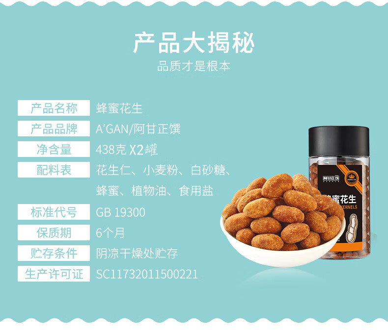 阿甘正馔蜂蜜花生米零食坚果炒货小吃下酒菜组合438g*2罐 曜石黑