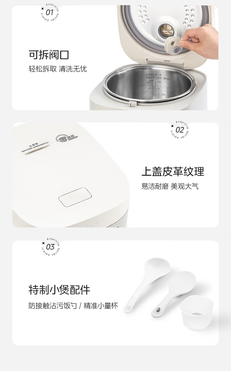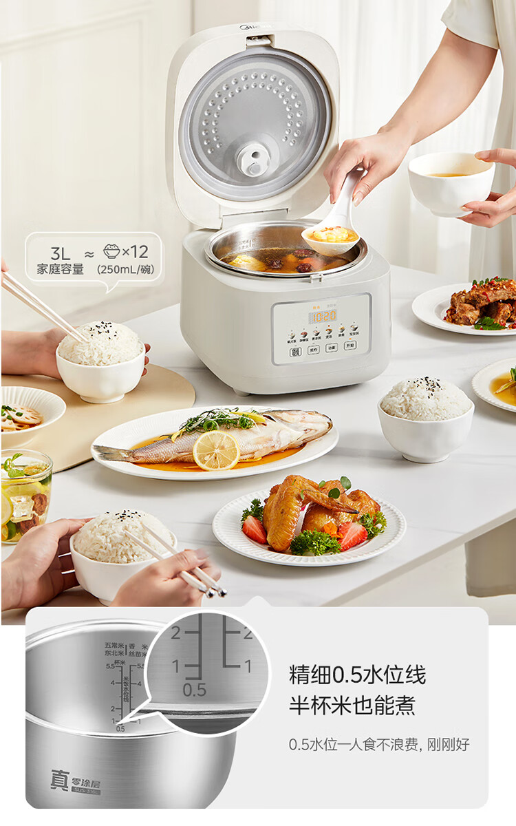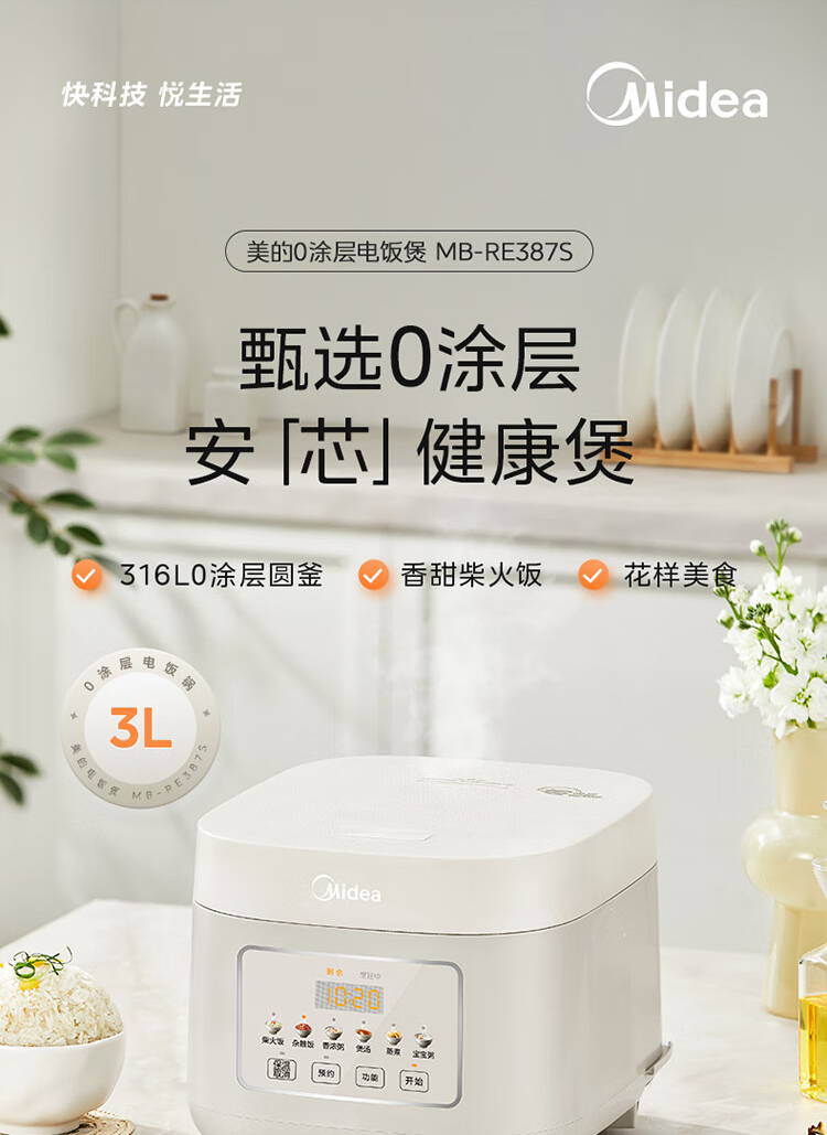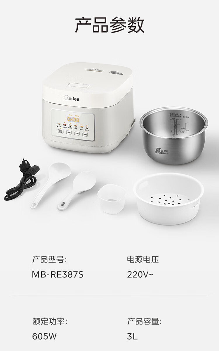 美的电饭煲 无涂层内胆电饭锅 3L MB-RE387S(单位:台) 白色