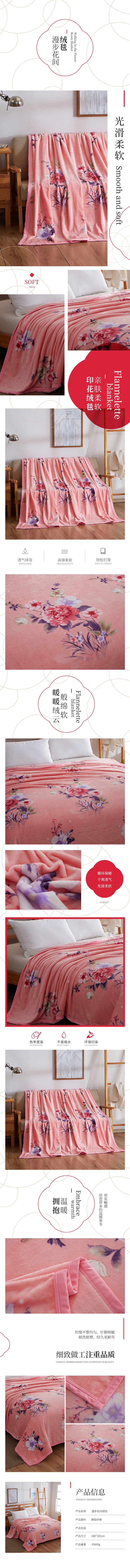 恒源祥漫步花间绒毯HYX021MT/180*200cm 粉色