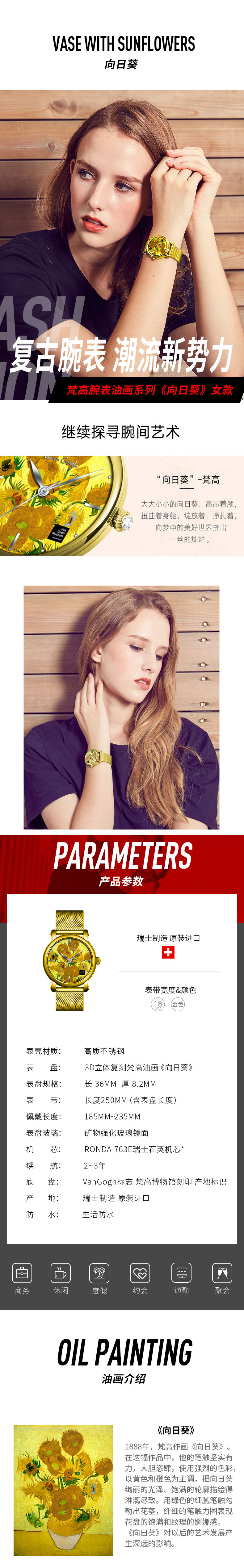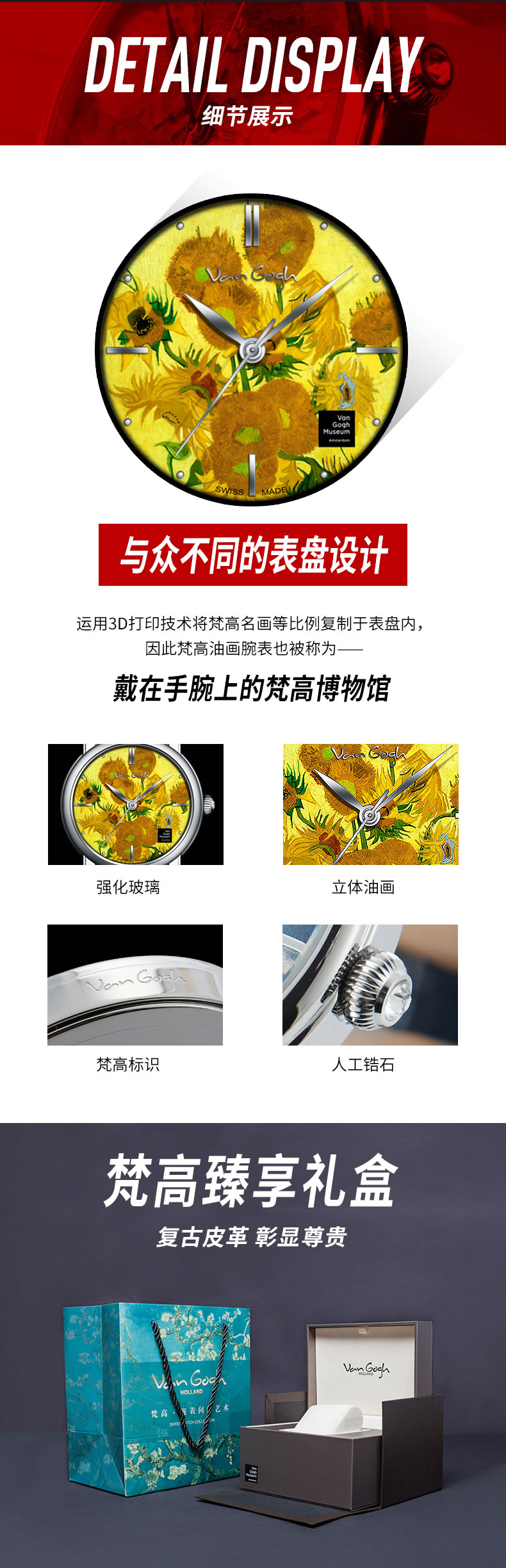 梵高(VanGogh)瑞士女士石英手表 3D打印油画表面牛皮表带个性网红潮牌博物馆正版原装进口女表 向日葵 黄色